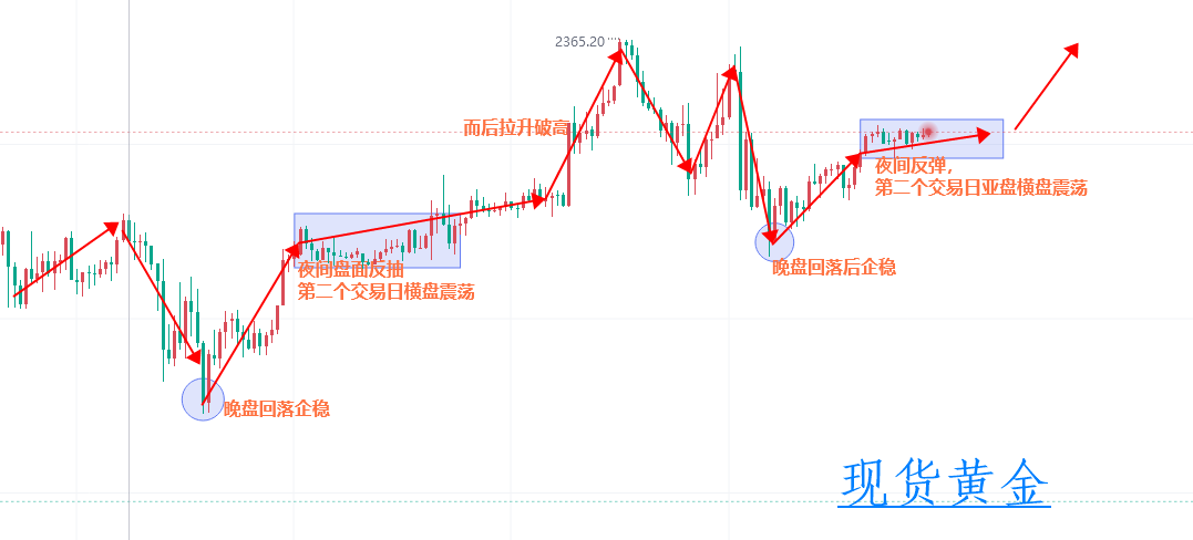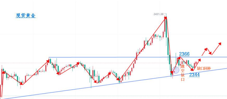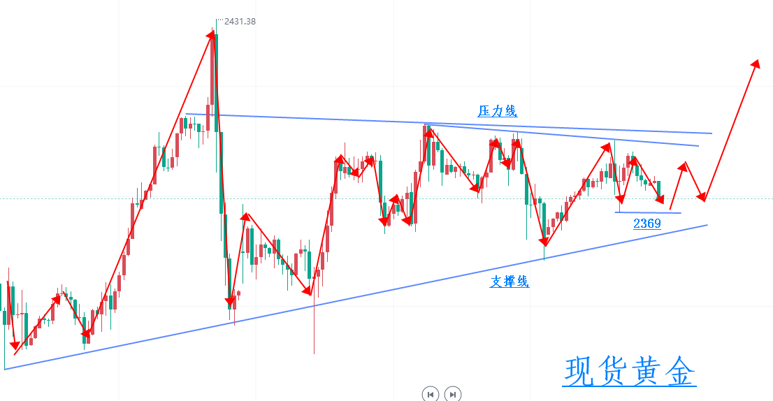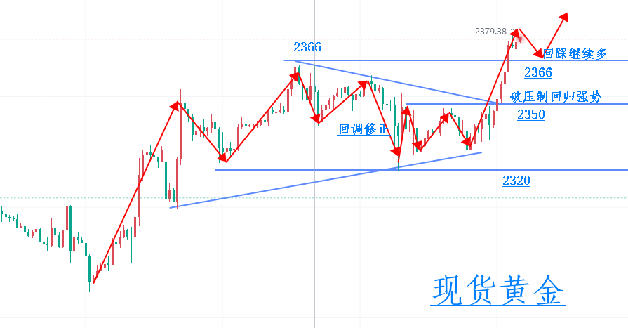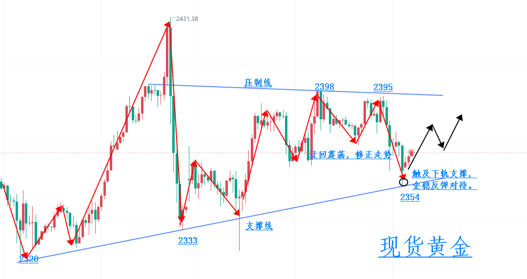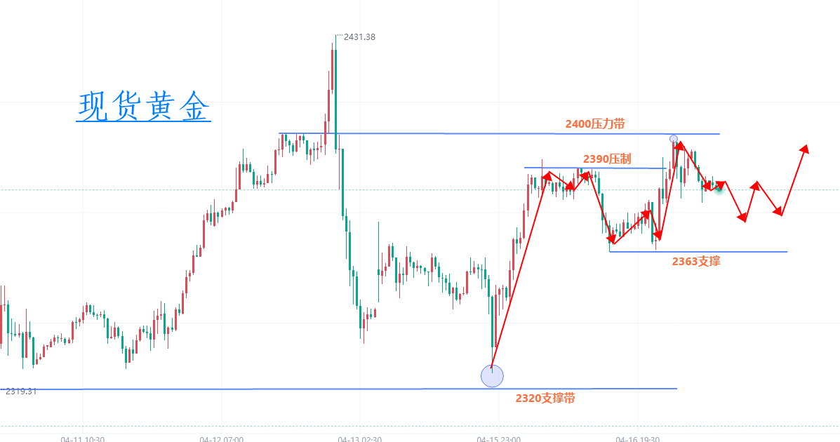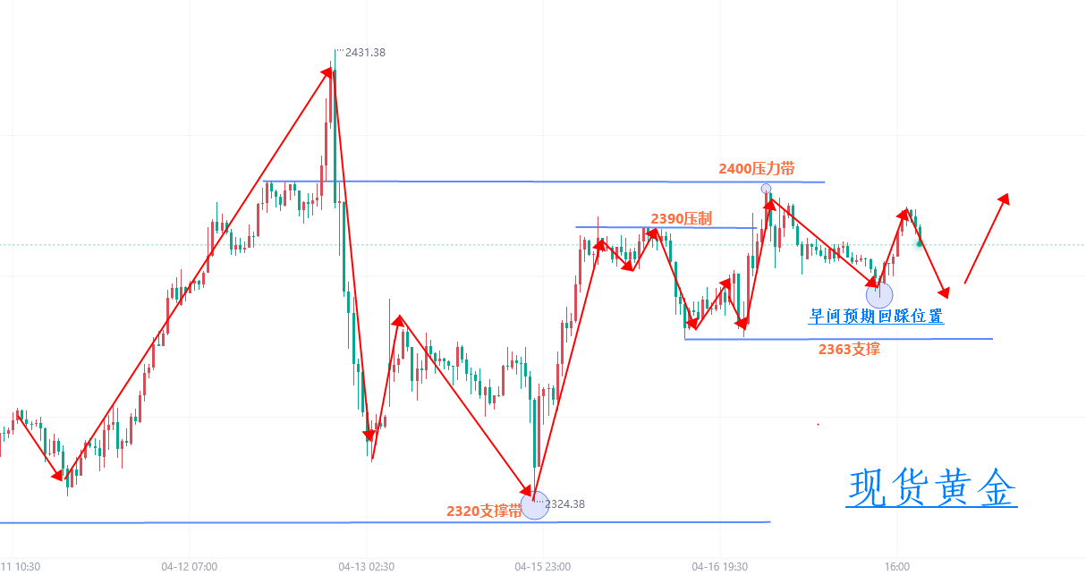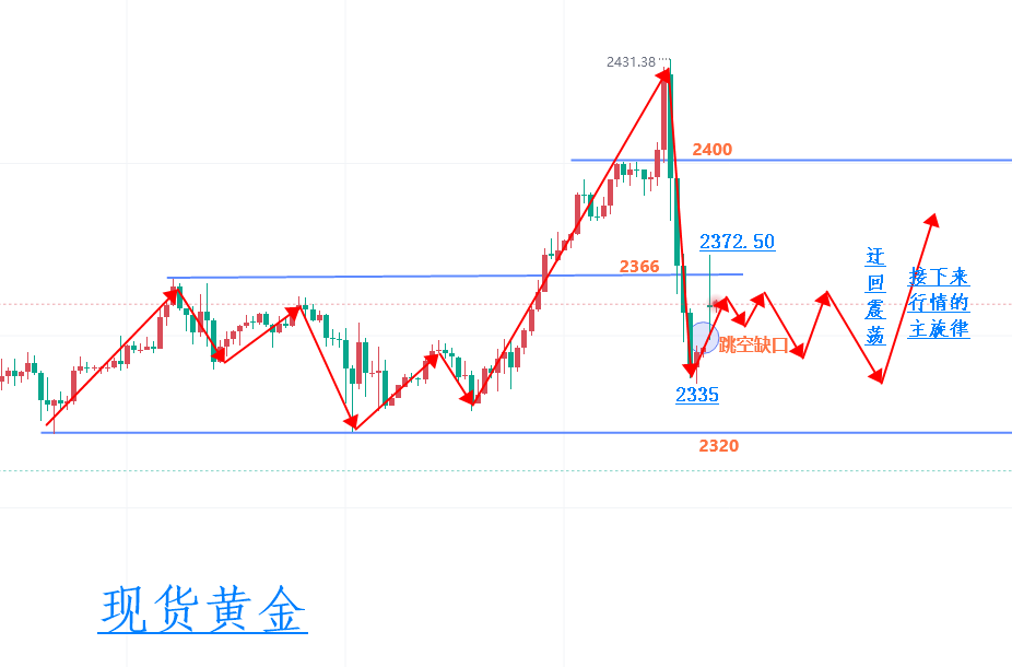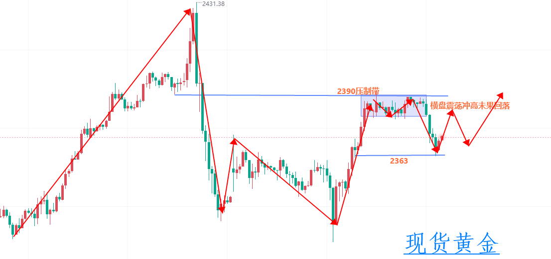 对本交易日布局的重点就是震荡,这也是本周开盘以来我们所强调和坚持的。早间盘面在冲高2390一带承压后,我们给出回落预期,持续横盘虽然给我们的回落空单带来一定的困扰,但最终回落2363下方位置,短线空单得以清仓。 上周尾盘的冲高回落,下挫达100美元之多,这就是限制了后续行情的涨幅,强势行情怕的就是冲高回落,尤其是这么大幅度的回落,这就注定在接下来的一段时间内多头无法持续形成单边形态,需要一个积蓄能量的过程,为后续的多头延续做准备,所以当下的反弹,很难形成时间上的连续性,短暂上升之后,遇到压制点还会有回落出现。 同样对空头来讲,上周尾盘触及2333美元后本周跳空高空,昨日晚盘虽有下破低