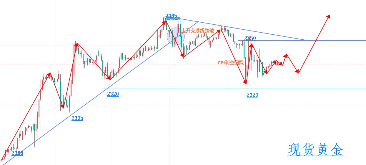 强于预期的CPI通胀数据削弱对美国提前降息的预期,美元和国债收益率走强,现货黄金大跌近20美元,最终企稳2320美元一线后反弹至2333美元一线收线,日线收阴,这也是本周以来第一次收阴,阴线的出现,打断了连阳节奏,但转阴并不代表转势,再强的多头都要允许修正出现,修正又是为多头延续服务,所以对多头的大周期预判不变,短线走一个调整仅此而已! 周三,美国劳工部表示,作为衡量商品和服务价格水平的CPI较去年同期上涨3.5%。这一涨幅略高于经济学家们的预测,并且比2月份的3.2%有所上升。 美国通胀连续三个月强于预期,互换市场完全消化的美联储首次降息时间从9月推迟至11月,6月降息的押注几乎消