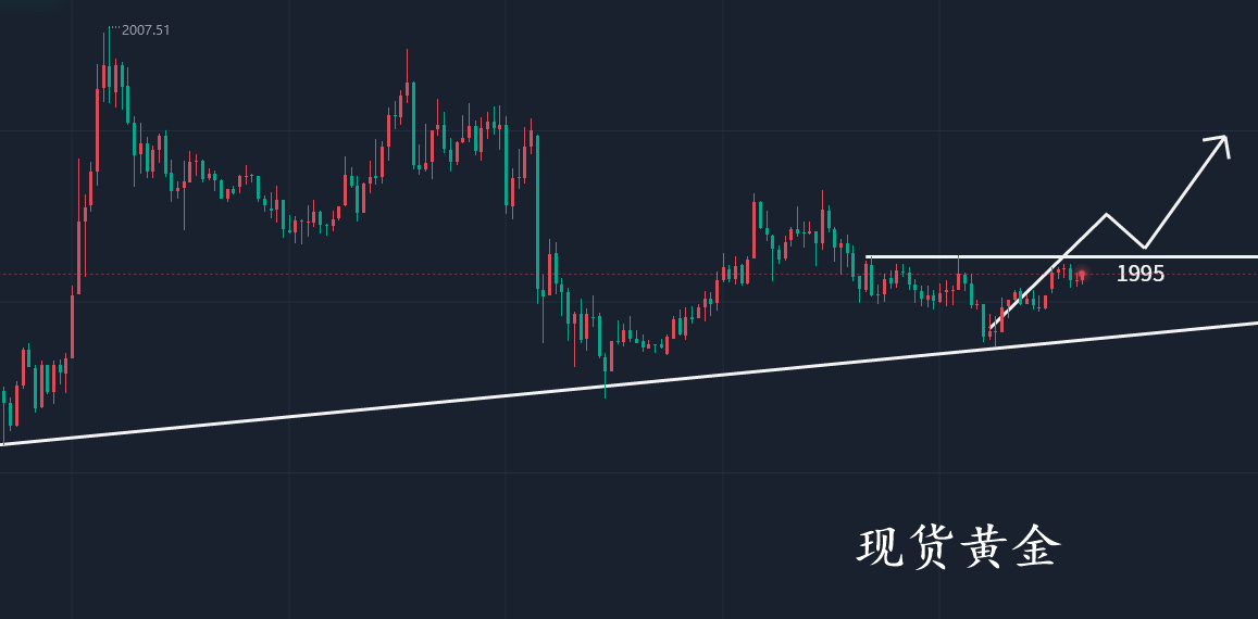不是井里没有水,而是挖的不够深;不是成功来的慢,而是放弃速度快!一杯水再烫再难忍,也不要放手 ,因为在放手的那一刻,你失去的不只有水,还有杯子。即使光环已不再也不要放弃你的梦想,哪怕行情没把握也不要过于自责。 断崖是山的挫折,却产生了壮丽的瀑布,上涨是空的结束,却迎来了多的延续。本周开盘走弱回撤1965一线后企稳,而后多头迎来反扑,步步为营,一路拉高,上一交易日亚欧盘冲高1993后修正回踩1985得到支持再度拉升,晚盘冲高2007上方,再一次回到前期高点位置,日线也是不断拉出长阳,多头开始展现实力,前高压制保不住了,日内有望刷新高点。 美联储会议纪要表明将美联储长期维持限制性政策,美