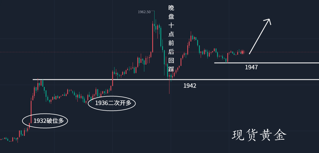 如果你看到面前的阴影,别怕,那是因为你的背后有阳光, 逆风的方向适合飞翔,可是逆势的交易只合适死亡。周三盘面开盘继续延续走强,一举拿下1930高地压制,多头犹如脱缰的野马,接连冲破1947,1953压力点,冲高1962上方。而随着1930的突破我们顺势在1932跟进多,同时午后回踩1936后二次跟多,晚盘明确提醒十点前后有回调,回调后继续多,最终晚盘也是回踩1938后再次冲高1956,整个布局和盘面走势相吻合,而盘面走势也如我们预期一般运行。 美联储加息延迟的预期的加持下,再加上加沙发生致命爆炸后,外交解决方案的希望日益渺茫,伊朗呼吁穆斯林国家对以色列实施石油禁运,市场避险情绪升温,加剧