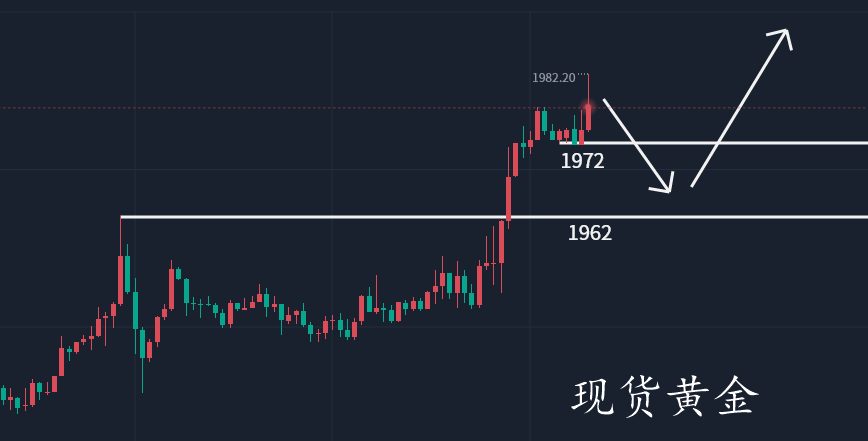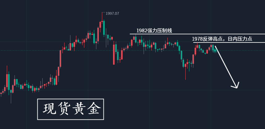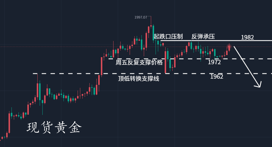 作为一个投资者,手里的每一个钢镚,都是你的雇佣兵,你得排兵布阵,让手里的兵上阵杀敌,而利润就是俘虏,亏损就是阵亡,善战者,致人而不致于人!如何调遣兵力,谁为上将,谁是前锋,谁打伏击,攻城掠地,你手里的每一个钢镚,都是你指挥下的将士。汝是韩信,点将之才?还是项羽,莽夫之辈? 本周开盘跳空低开后,未能低开低走,在1965下方形成支撑反弹,在连续冲击1982一线承压后围绕1972到1982区间震荡,日线再次收出长上影阳线,连续呈现出冲高回落姿态。周末周评我们给出顶部大概率出现的预期,高空是我们布局的重心,本交易日也不例外。 上一交易日早间盘面低开下行回落1965后企稳,亚欧盘震荡反弹,