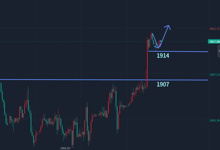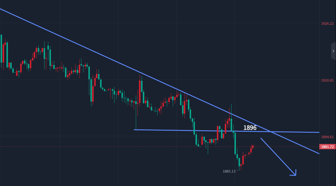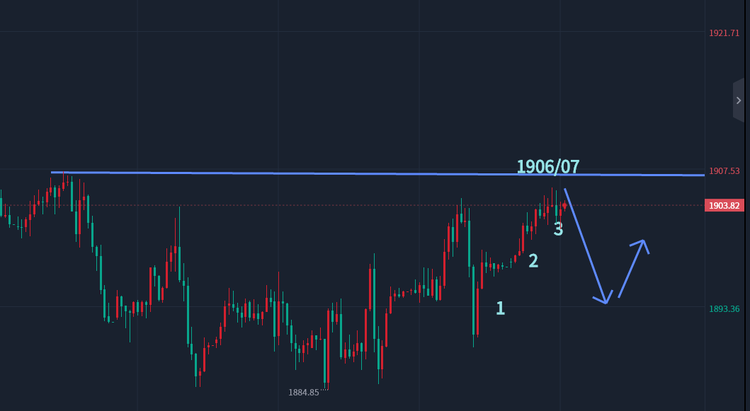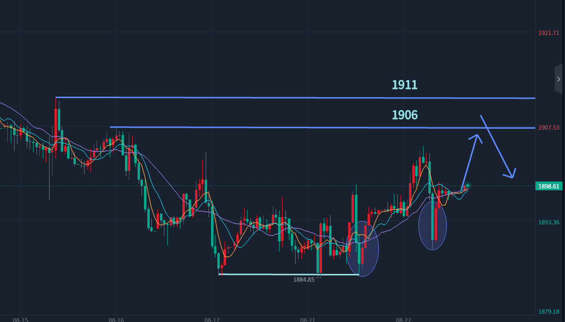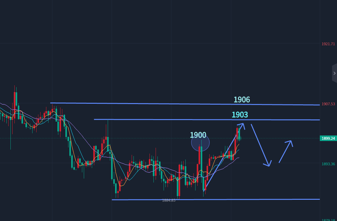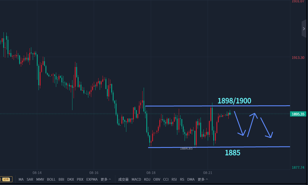 美债收益率升至近16年高位的涨势暂停,令非收益黄金获得些许喘息。欧元区最新一波PMI数据表现不佳,欧元闻讯下挫,美元则顺势攀升刷新两个月高位,不过面对坚挺美元的压力,国际金维持在1900上方震荡反复,上攻颓势明显。 全球最大的黄金ETF SPDR Gold Trust表示,周二黄金持有量下降0.5%,跌至2020年1月中旬以来的最低水平。 本交易日早间盘面我们直接给出开多布局,这个开多就是拿一个短线反弹,至昨日晚间盘面到目前,昨日夜间冲高一次,日内亚盘冲高一次,欧盘再次冲高,已经出现三次上攻动作,而并未甩开昨日高点1904,出现上升的顺延情况,只是略微破高,所谓一鼓作气再而衰三而竭,再想多上