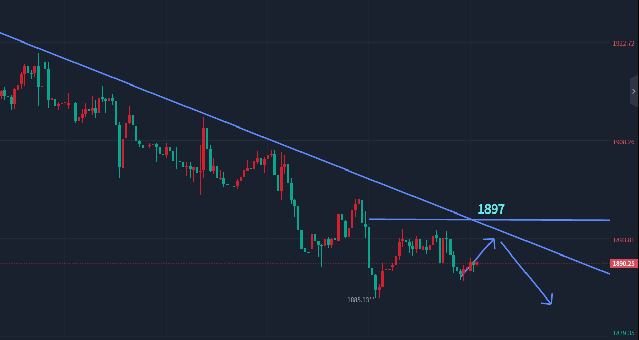 本交易日开盘后,亚盘时段围绕1895/96反复徘徊后,午后突破1900,冲击1902上方。亚盘横盘不跌,反而上破,这就难以直接回到弱势形态,真真走弱的行情,亚盘震荡后一定有回头,至少要往下走一走,而再次反弹破高,反弹出现连续性,这个时候就不能再去闷着头去空,这就有前面的单边下跌,进入震荡了。 上一交易日晚盘回落后,盘面价格再次触及1885美元低点一线,夜间盘面出现反弹,并没有维持低位收线,这和以往的情况不同,前面多个交易日围绕低位收线,而后接下来的一个交易日亚盘小反弹,欧美盘再走回落进而破低。而当下收线不能收在低位,这个节奏就变了。夜间探底回升,本交易日亚盘又延续反弹,那么这个修正就要再往上