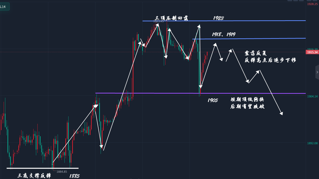 周五盘面,我们主要围绕1920到1905的区间,来做高估低渣,最终盘面走势基本符合我们的预判。稍有出入的就是反弹再一次冲击1923附近,然并未突破,最终承压回落,形成三顶形态,随着顶部出现,价格有强转弱,晚盘下滑跌破1914一线,最终回落到我们预期的1905支撑,在这里走出顶低转换形态,尾盘顺利反弹至1915上方,抵达反手多目标位置。 备受瞩目的美联储主席鲍威尔央行年会讲话落下帷幕,鲍威尔在8月25日在央行年会上称,过去的加息尚未完全减缓经济增长,这是目前维持利率不变的理由,尽管更强劲、持续的增长可能需要更高的利率来保持通胀下降。他强调将谨慎行事,决定是进一步收紧货币政策,还是保持政策利率不