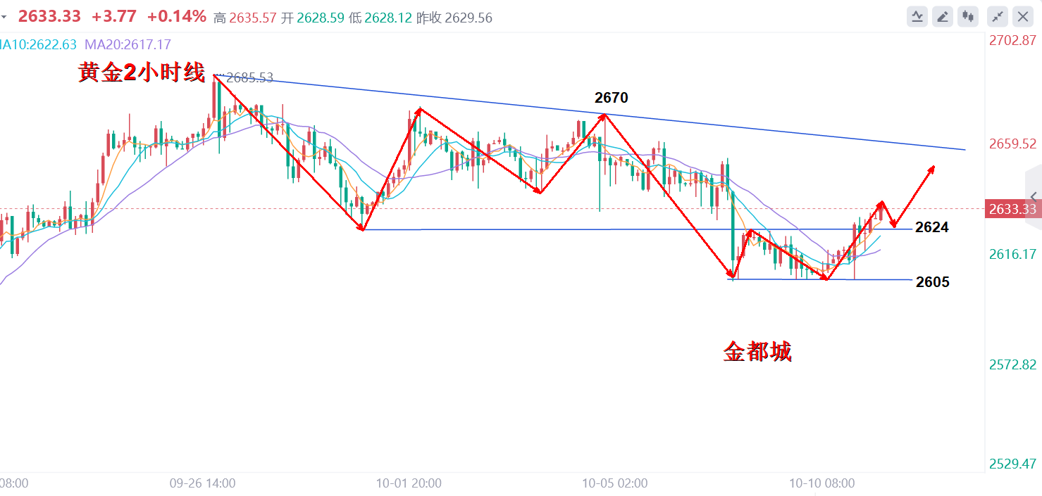 黄金价格逼近 2630!美国 CPI 呈现六连降态势,创下自 2021 年 2 月以来的新低。与此同时,美国至 10 月 5 日当周初请失业金人数录得 25.8 万人,高于前值 22.5 万人,成为 2023 年 8 月 5 日当周以来的新高。美联储博斯蒂克对 11 月不降息持开放态度。另外,以色列安全内阁将决定如何回应伊朗袭击,而伊朗方面则警告称可能改变核原则。 隔夜美国公布CPI和领取失业金人数后,美元指数冲高回落,黄金反抽上行,让前期偏弱的形态继续回归区间运行为主,另外基于凌晨没有过多的回撤而是再度上行测试2631附近,对于日内来说难有较大的下行空间了,增加了继续反弹的需求。上一交易日