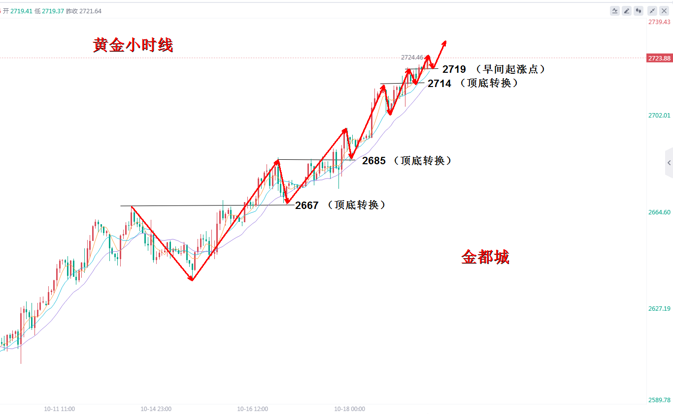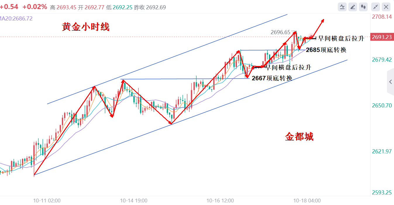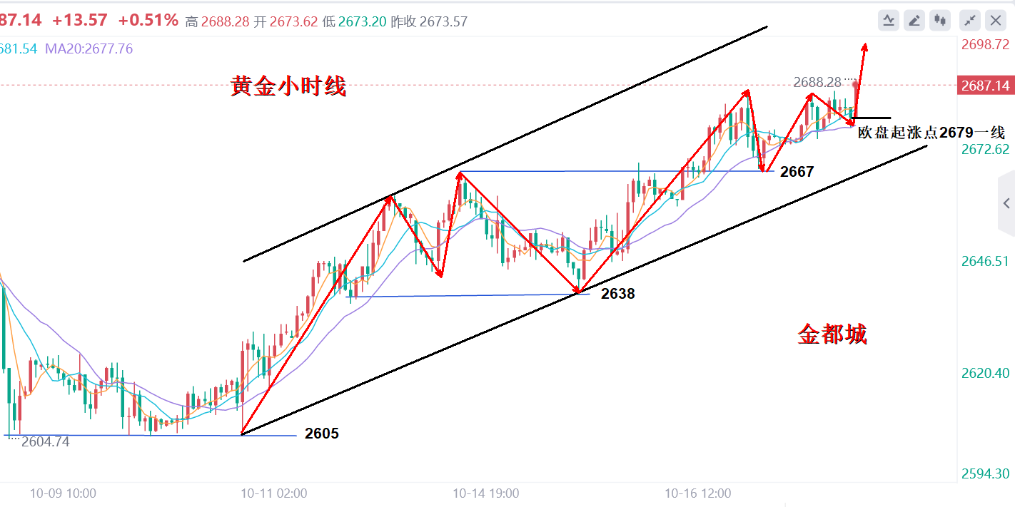 金价在日内亚盘波动空间不大,但上方以昨日高点2685一线遇阻没有延续性的走低,而是高位盘整来运行,从早间的起涨点到欧盘再度拉升的过程中低点是逐步上移的,欧盘的再度走也是延续了多头强势的格局,所以晚间继续顺势看涨。 日内基本面方面: 首先,欧洲晚间有利率决议 欧洲股市周四早市走高,投资人等待欧洲央行发表鸽派言论,另一方面,企业财报表现好坏参半。欧洲央行在九月小幅降息之后,预计周四将削减利率25基点,为今年以来第三次降息。 由于通胀的放缓,欧元区经济的疲弱,货币市场将寻找欧洲央行的任何线索,包括行长的评论 ,以证明他们有关在2025年3月前再降息三次的预期是合理的。 但是目前市场普遍预期的市场已