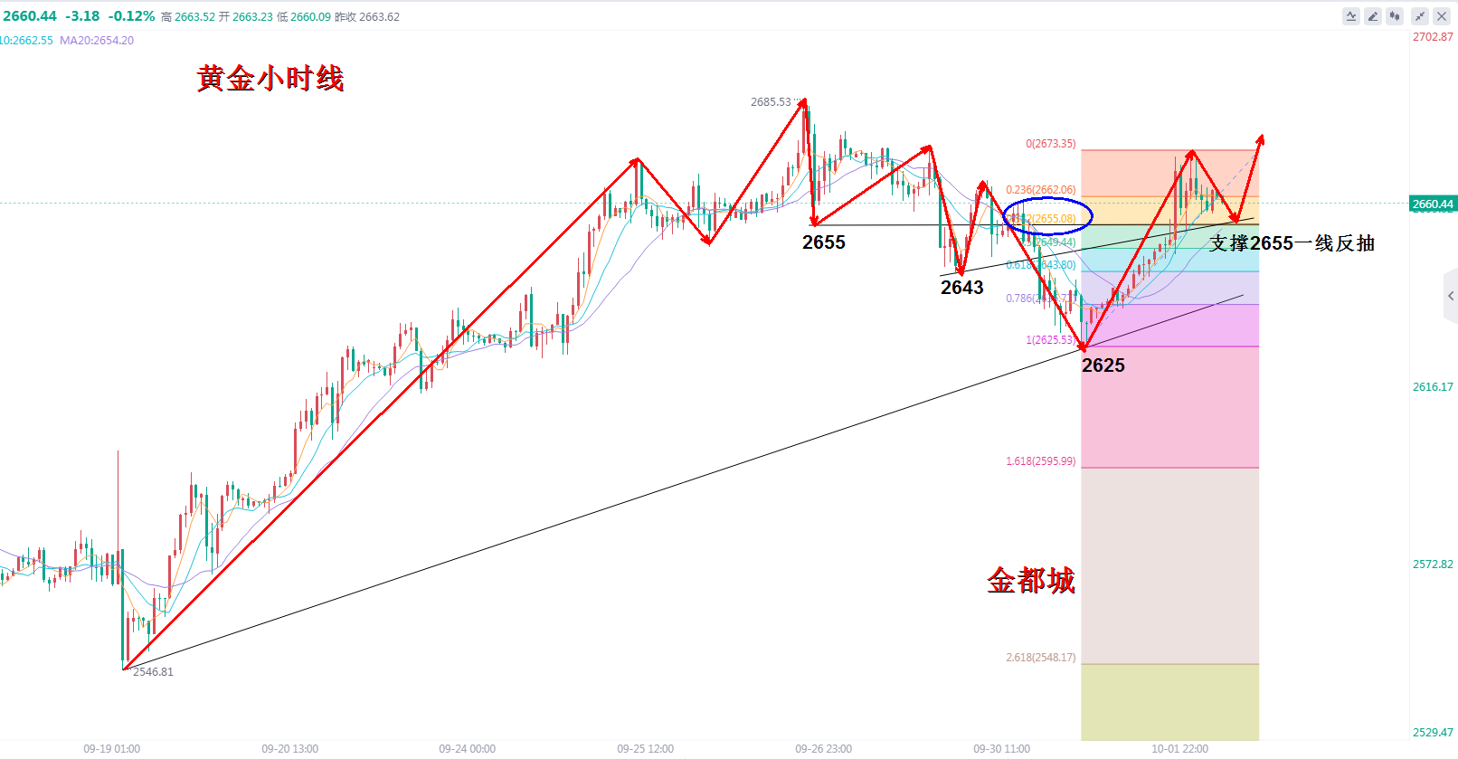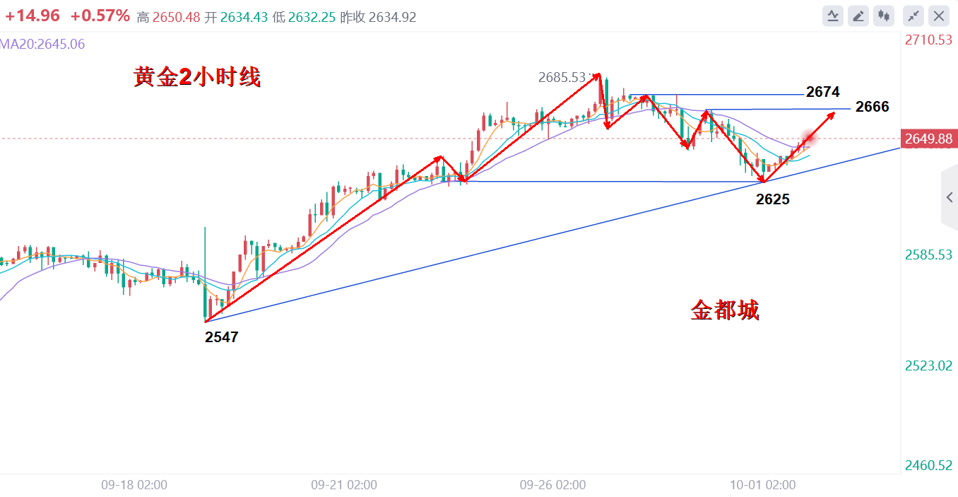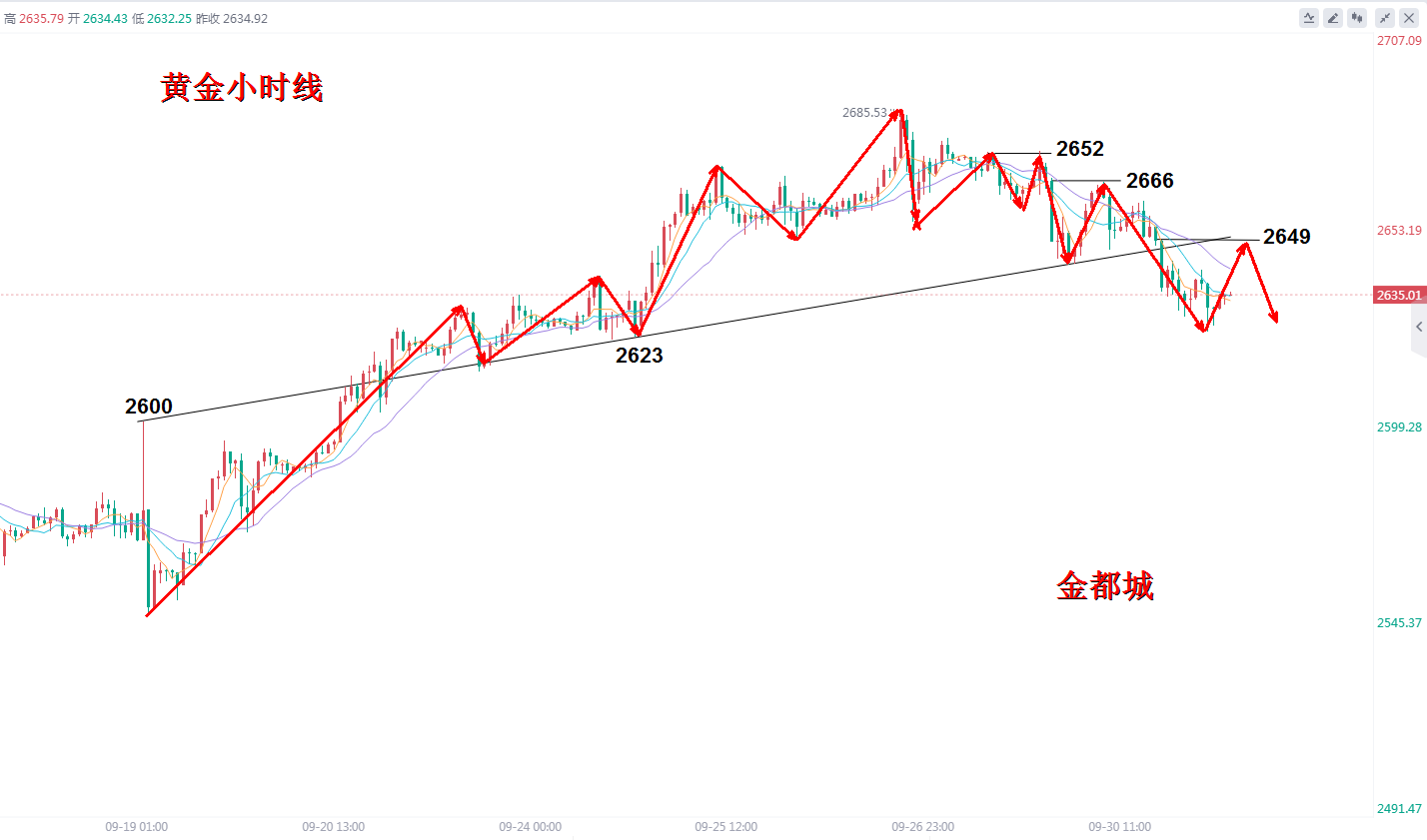 鲍威尔竟给大幅降息当头 “泼下一盆冷水”。在鲍威尔讲话之后,美元指数迅速拉升,一度刷新日内高点,不过随后又回吐了部分涨幅,最终收涨 0.304%。与此同时,美债收益率也集体反弹,短期美债收益率更是一马当先领涨。基准的 10 年期美债收益率收报于 3.787%;而对货币政策更为敏感的两年期美债收益率则收报 3.647%。 在美元和美债收益率双双走高的拖累之下,再加上投资者纷纷涌入 A 股以及获利了结情绪的影响,现货黄金持续回调。盘中,黄金价格最低触及 2624.87 美元 / 盎司,这与我们昨日晚间所预期的回踩支撑点 2623 极为接近。 那么金价的不断走低,是否意味着趋势的转折,多头终结,开