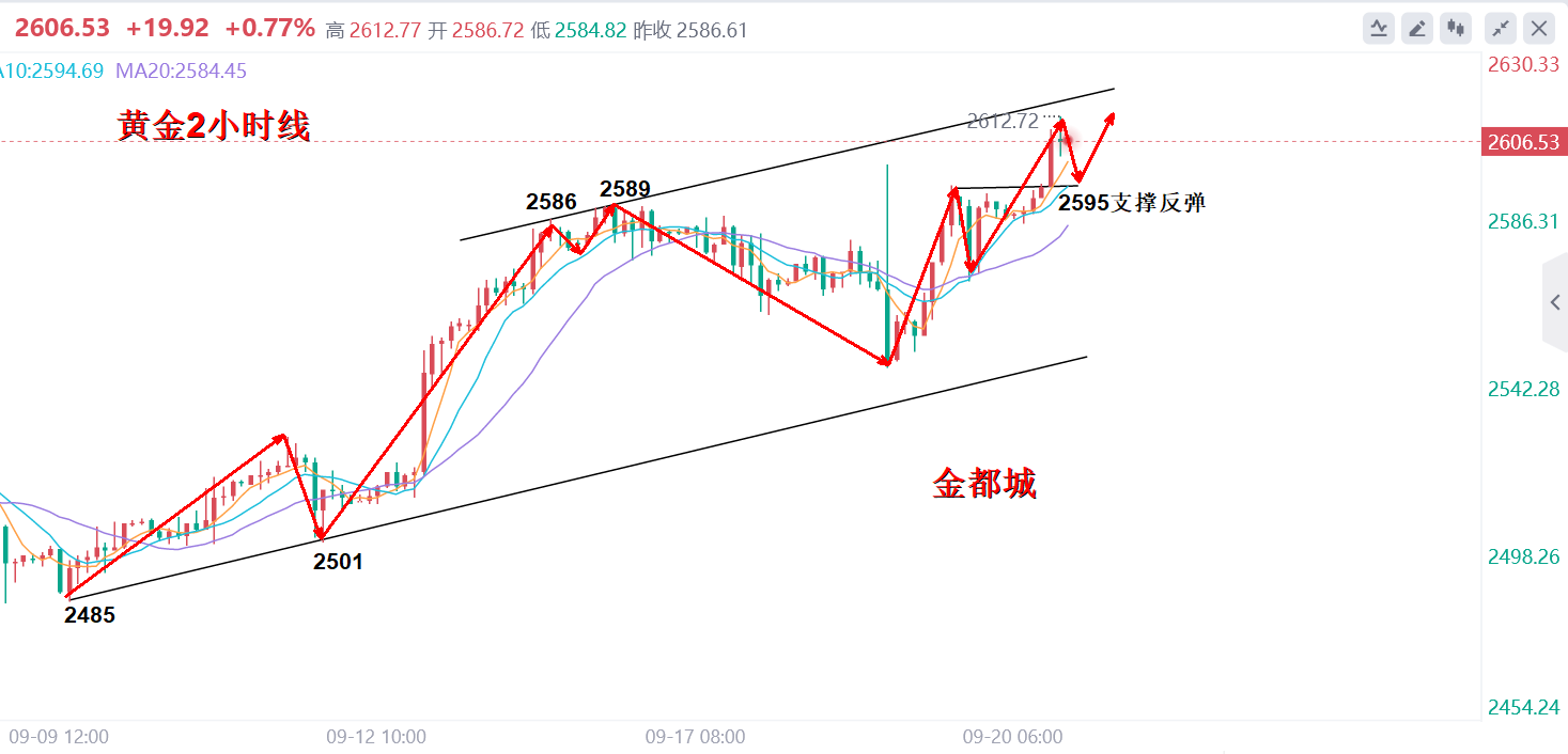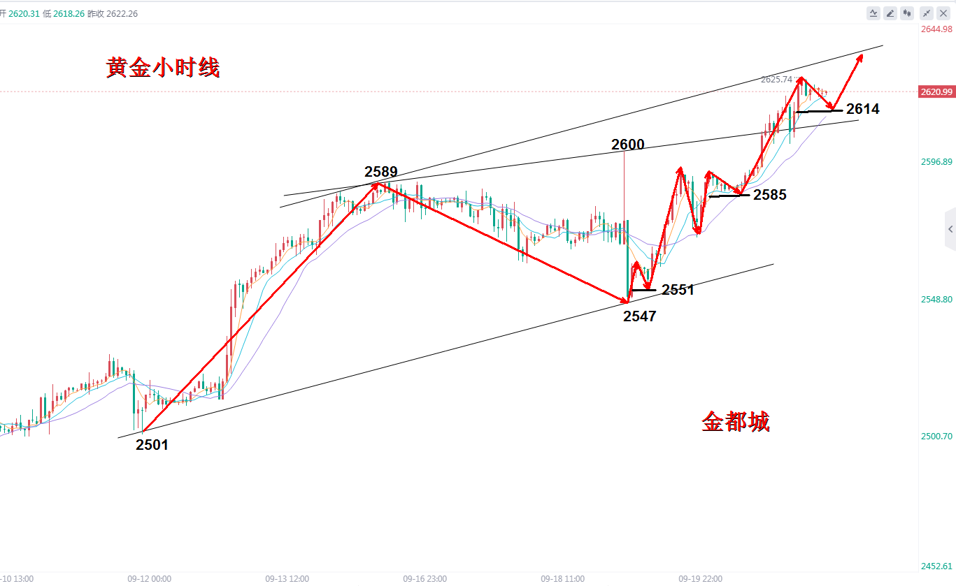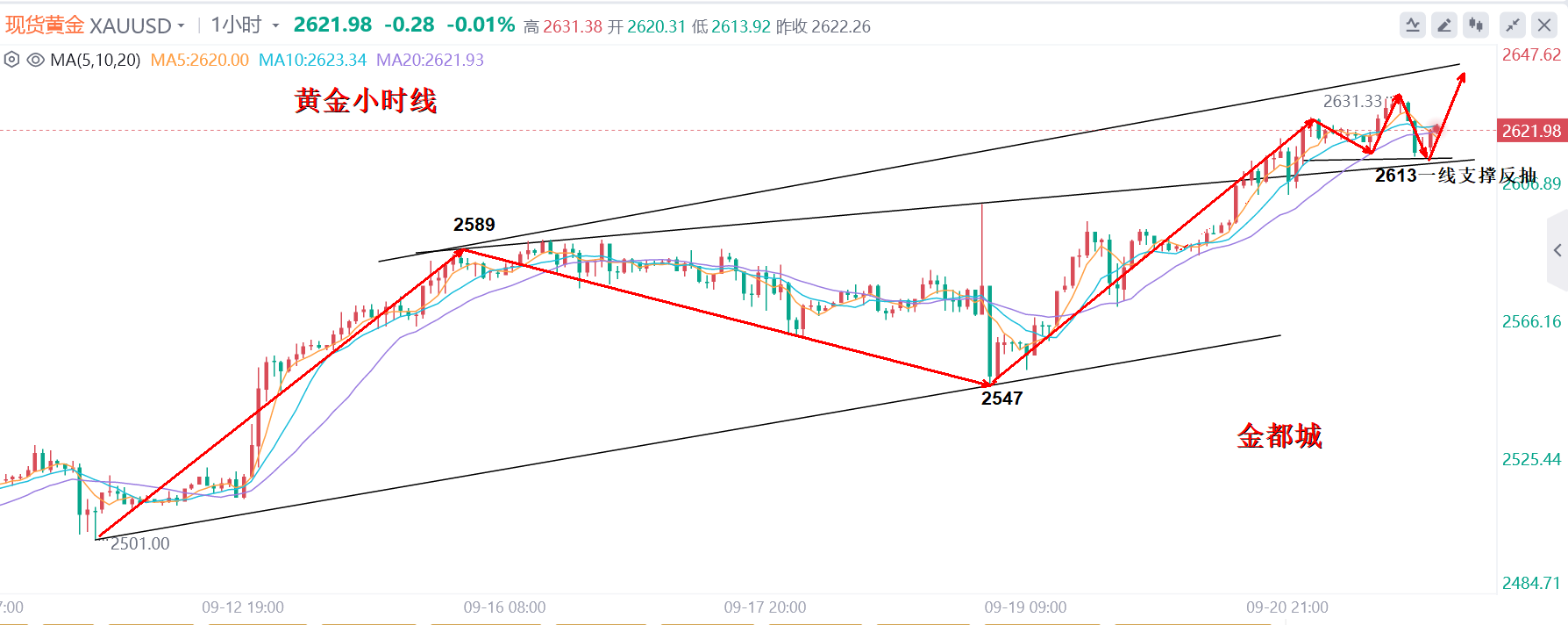 黄金本周强势收盘在2622附近,最高测试2625.80一线;周线和日线都是两连阳而且实体饱满,这对目前多头优势来说下周延续看涨是必须,基于从能量的转换来说,拉升属于能量的释放,修正属于能量的蓄积,目前形态不断释放多头动能走高,后面也有调整修正的风险需求,加上顺势为主,所以下周继续看涨的同时操作上以逢低多! 下面我们从欧洲央行行长的言论,近期地缘关系状况,黄金具体走势进行剖析以及做下周的规划: 首先基本面方面: 在美联储降息50个基点、推动美国股市创下历史新高两天后,欧洲央行行长警告称,全球经济正面临着“经济民族主义”、全球贸易崩溃和20世纪20年代大萧条的压力。 克里斯蒂娜·拉加德周五在华盛