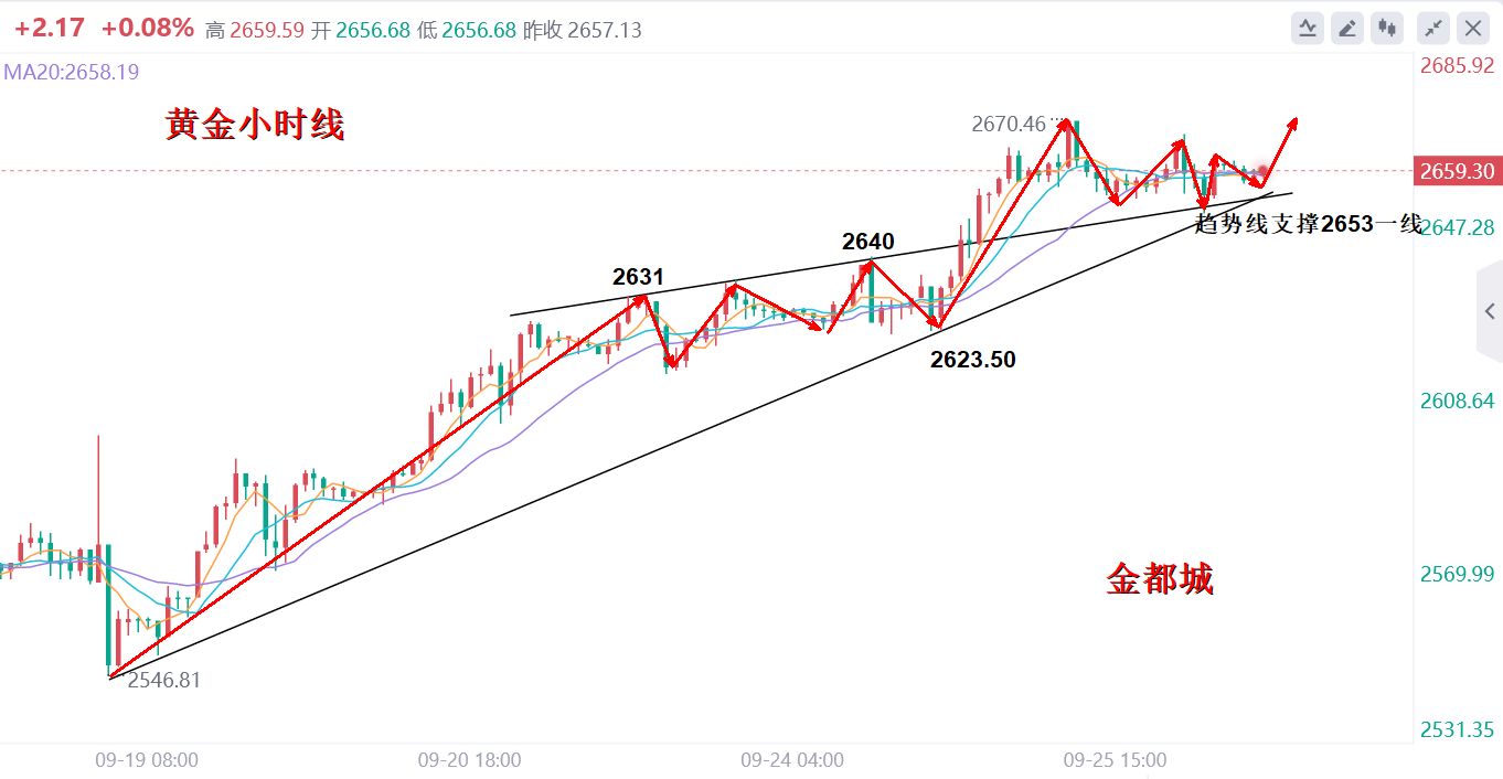 金价在亚盘继续刷新新高2670.50附近,随后午盘左右冲高回落,午盘到欧盘继续以回调修正形态运行,欧盘支撑在2651.50一线没有继续走低,欧盘以及美盘继续看循环上行。 首先基本面方面: 美国9月消费者信心指数意外大幅下挫,创三年来最大降幅,市场预期美联储将11月将再次降息50个基点。美国谘商会发布的报告显示,由于对未来劳动力市场和整体经济前景担忧的加剧,美国9月消费者信心指数大幅下降6.9点至98.7,低于预期,也创下了2021年8月以来的最大跌幅。数据公布后,今年的降息预期有所上升,2025年的降息预期次数在4次左右。 而且早间我们也说过近期黄金走势的强势拉升,黄金ETF资金不断的在流入