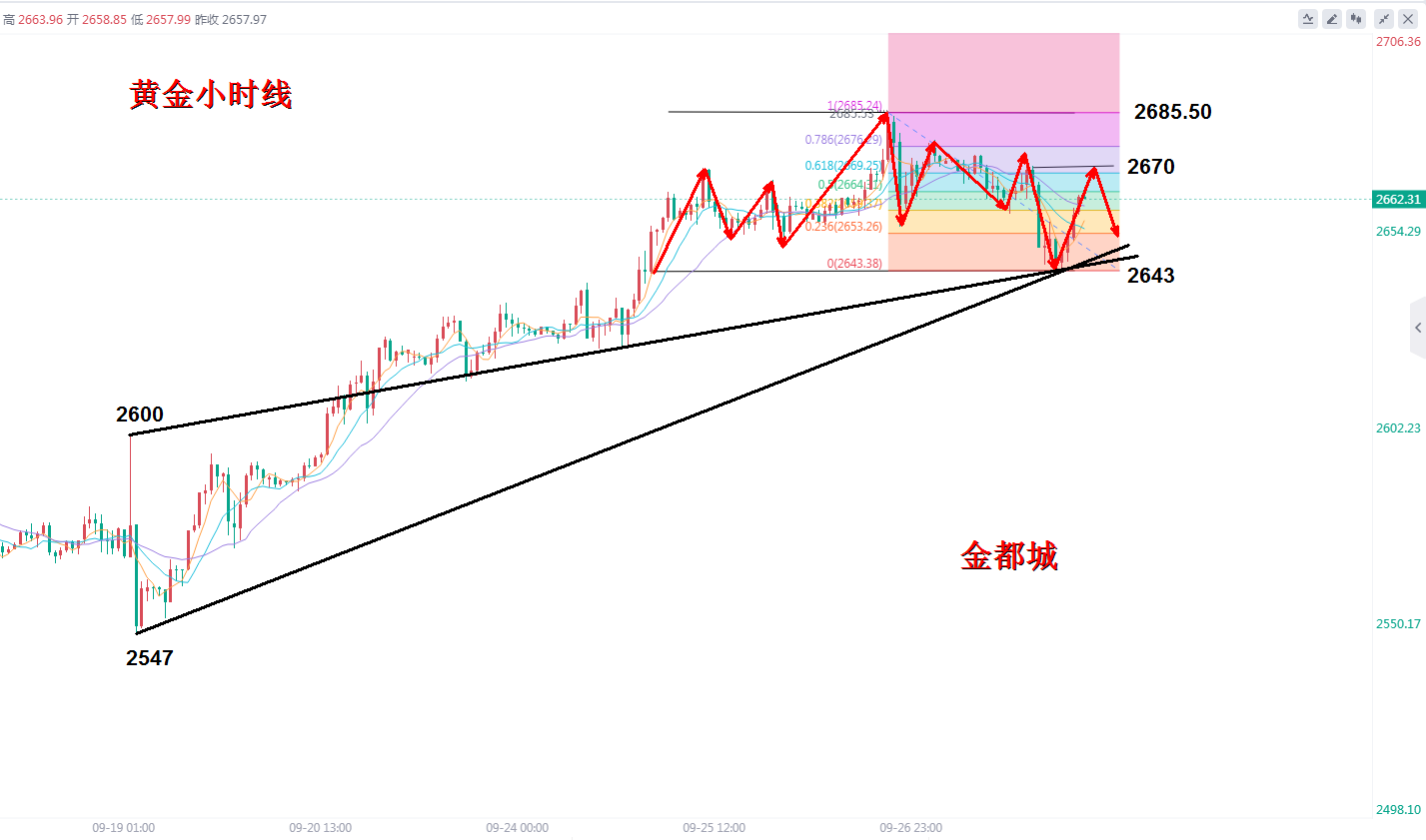美国 8 月核心 PCE 月率竟然创下 5 月以来的新低,这是不是意味着美联储在 11 月又要 “放大招” 呢?再看中东那边,以色列可谓是大动作不断,几乎把真主党高层给 “团灭” 了!这一系列的事件就如同金融与地缘政治舞台上的一场激烈风暴,再加上本周超级非农周,贵金属究竟会带来怎样的惊涛骇浪呢?让我们拭目以待。 黄金上周测试2685.50附近后没有继续破高,日线收阴收盘在2658附近触及MA5日均线,上周四收阳线上方留有上影线,周五收阴下方留有下影线,这对后面走势来说震荡的成分增加了,但是整体趋势依然属于多头,回撤也只是修正的一部分,所以今日周一看区间运行为主。 下面我们从近期中美两国股市情