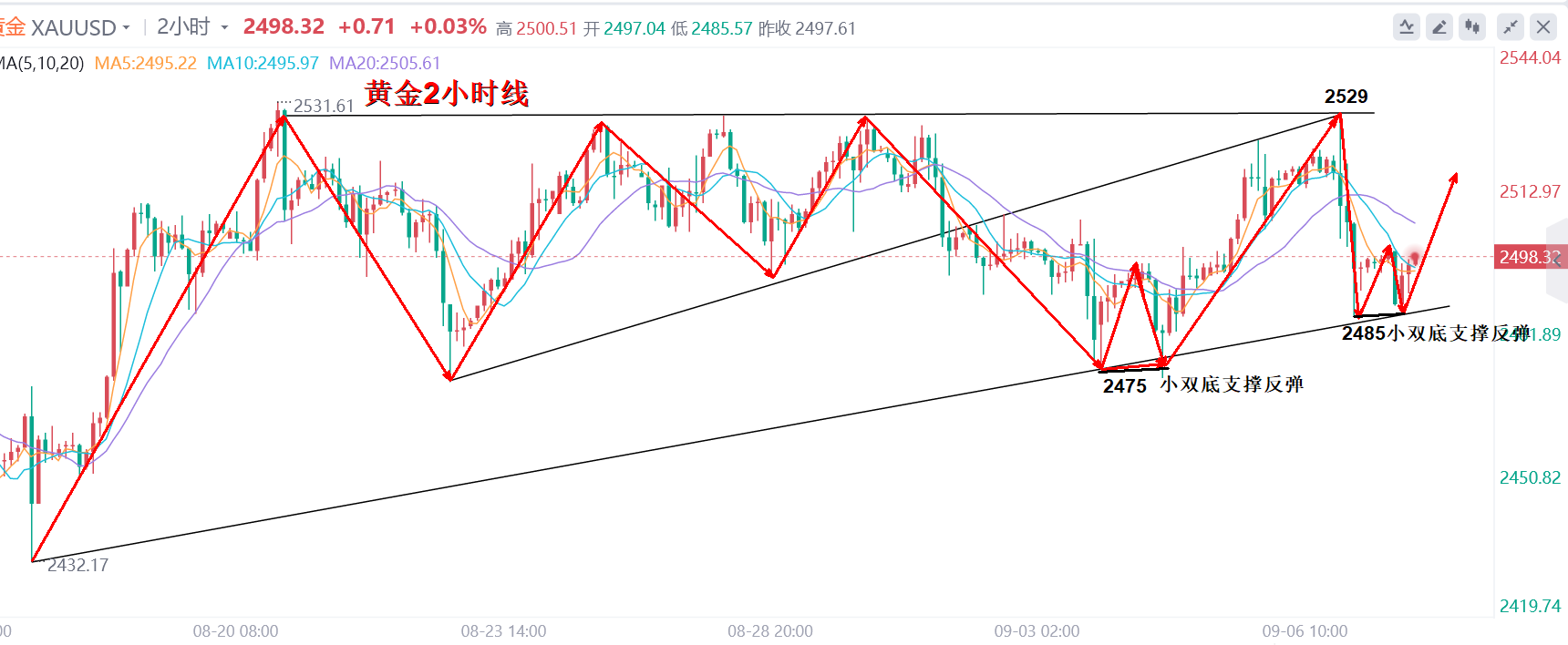 金价周五晚间上又一次遇阻在2529后回撤, 日线收阴。非农数据不及预期,美联储古尔斯比:美联储内部普遍共识是将进行多次降息。在数据和消息面的刺激下金价形态上都有上升的呈现,但是随后还是走了下跌,最低测试2485一线。今日周一,笔者不看延续走低,看上行补涨。 理由有三, 其一,周五晚间非农数据公布后不仅股市普跌,美股三大指数集体跌超1%。大型科技股集体走低,英伟达跌4.09%,特斯拉跌8.45%。费城半导体指数跌4.52%,本周累跌12.22%。30只成分股全军覆没,博通收跌10.36%。 美元指数,美债10年期以及2年期都走了下跌,大宗商品原油,金属类,贵金属黄金白银,期货现货也都走了跟随性