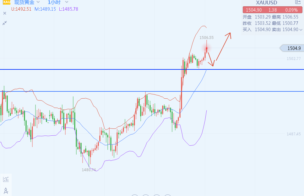 黄金资讯解析 金价周四触及近两周高位,因美国疲弱经济数据提升市场对美联储将再次降息的预期,铂金则跳涨至逾三周最高水平。现货黄金上涨0.7%,报每盎司1501.97美元,盘中稍早触及10月11日以来最高。陈大宾认为“现在金价上涨是因为美国耐久财数据不及预期,过去几周,我们看到这些数据较预期都有差距,无论是零售销售还是耐用品数据,以及一些PMI数据。总的来说,这为美联储在年底前再次降息提供了理据。” 黄金走势解读 黄金日线上来看,黄金日线收大阳线,日图破位收涨,阳线饱满且稳固,此前黄金一直围绕着1480-1495区域内盘整震荡,昨天突破1495延续性走强,目前处于短期线上方运行,5日与10日均线