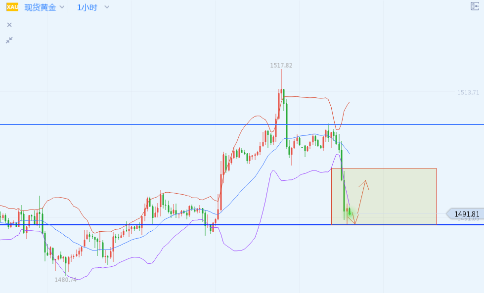 现货黄金行情涨涨跌跌都可以创造利润空间,关键是要看你是否把握的住,有时候跟对老师,选好模式,赚钱其实不是难事。如果你现在亏损的很严重,很迷茫,看不到希望,可以联系彭宇鑫,我给你出谋划策,树立信心。彭宇鑫相信世界上没有不赚钱的投资,只有不合理的操作,关注彭宇鑫,关注长期收益! 技术面: 黄金日线上来看,金价继续呈现窄幅整理格局,近一周金价都在布林线下轨和中轨之间震荡;MACD死叉,绿色动能柱不变,KDJ有点金叉趋势,但信号都比较弱,短线缺乏明显方向。K线继续阴阳循环震荡,小阳小阴实体K线较小。此前的区间1497-1478内持续震荡,短期不打破区间继续看震荡。而随着时间的推移,日图下行趋势线的防