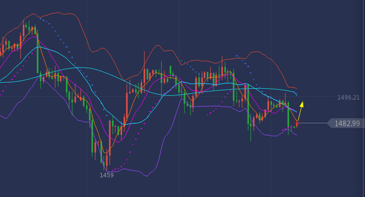 消息面:周五(10月11日)金价走低,现货黄金盘中一度跌逾1.3%,创10月1日以来新低至1474.08美元/盎司,因市场对中美国贸易争端和英国脱欧的担忧有所缓解,对高风险资产的兴趣重燃;不过纽市尾盘,受贸易谈判消息刺激,金价回升近15美元至1489.01美元/盎司,贸易谈判的乐观预期市场已经提前消化市场,等待确认贸易谈判和英国脱欧的最终结果。 黄金:黄金价格维持短期均线和布林带上下轨方运行,下方刚好触及布林带下方支撑回升,并且带动短期均线逐渐向上拐头,理应有利多头发展,但是,由于其它各周期指标仍然保持空头排列,布林带整体倾向下行,再加之MACD背离死叉双线势能显示衰竭,KDJ指标高位拐头又
