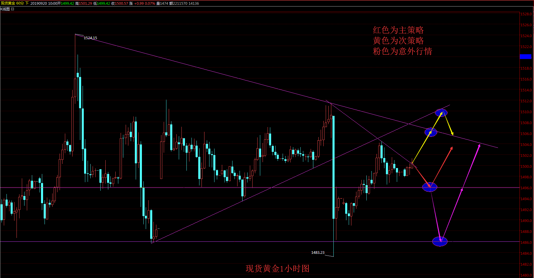 昨日行情回顾:昨日黄金再1494附近开盘后小幅走跌到1488.90附近,随后一路慢涨震荡上行,亚欧盘时段在1498附近多次下探后企稳继续上行,最高到达上方1504.40.随后承压下行开始走跌,下方最低触及1496.45,随后陷入震荡与1498.8附近以小阳线收尾。 现货黄金日内行情分析: 日线级别来说目前在9月5日延续跌破1500关口后已经连续7个交易日在1480-1520来回震荡,当然最多的还是1480-1510这30美金区间内,反复震荡依托1480强支撑以时间消耗空头能量完成筑底,目前5/10日均线在连续多日震荡时候金叉形成,而金价也站上了5日均线,10日均线在1496附近,目前还不
