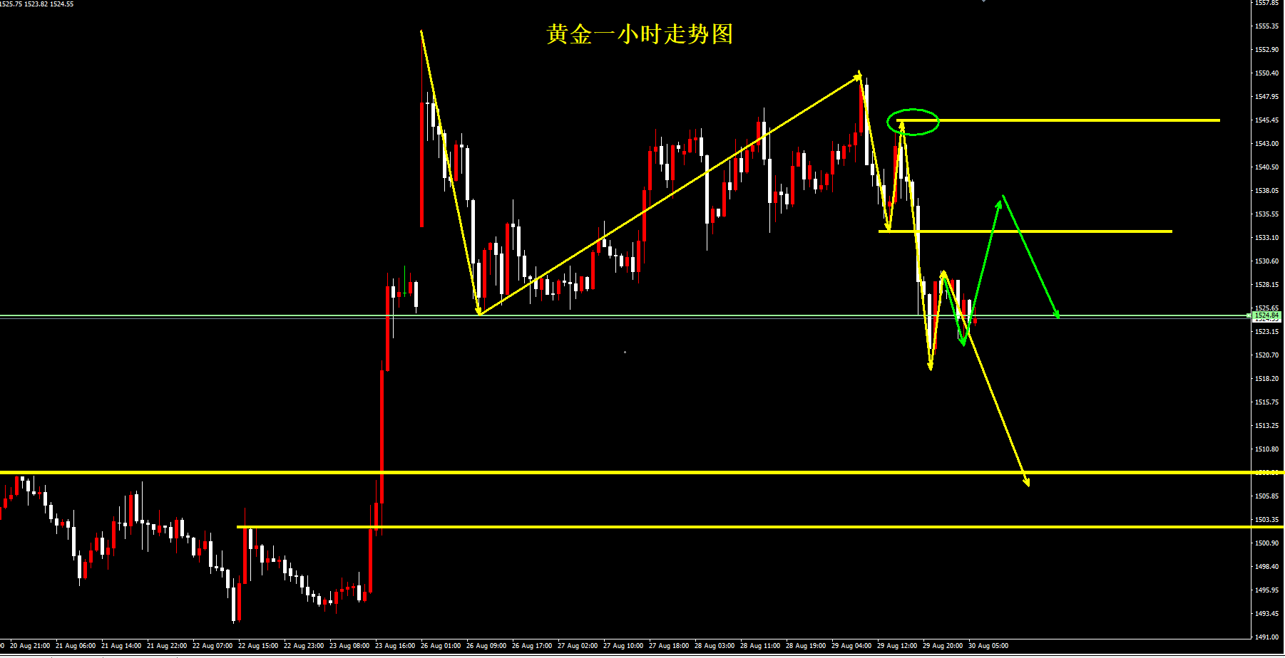 8.30黄金走势分析: 黄金昨天经历了一波四折的走势,先是从1537拉升至1550高点,欧盘从1550下跌至1533位置反弹,美盘在美国GDP和周初请失业金数据公布后,价格再度反弹到1545价位,尾盘价格则出现了一波大跌行情,最低触及1519价位,日线最终在1527以中阴线报收。周一黄金跳空高开触及1555位置回落在1525支撑反弹,随后价格一直在区间内运行。对于黄金走向的分析,一直在关注1525价位的得失。因为这是日线从1400价位拉升K线低点不断抬高的属性跟踪,昨天价格的下破,在日线级别已经可以看到1400-1555上升段落的结束。段落的结束意味着迎来对应的调整,并不意味趋势也结束,但会