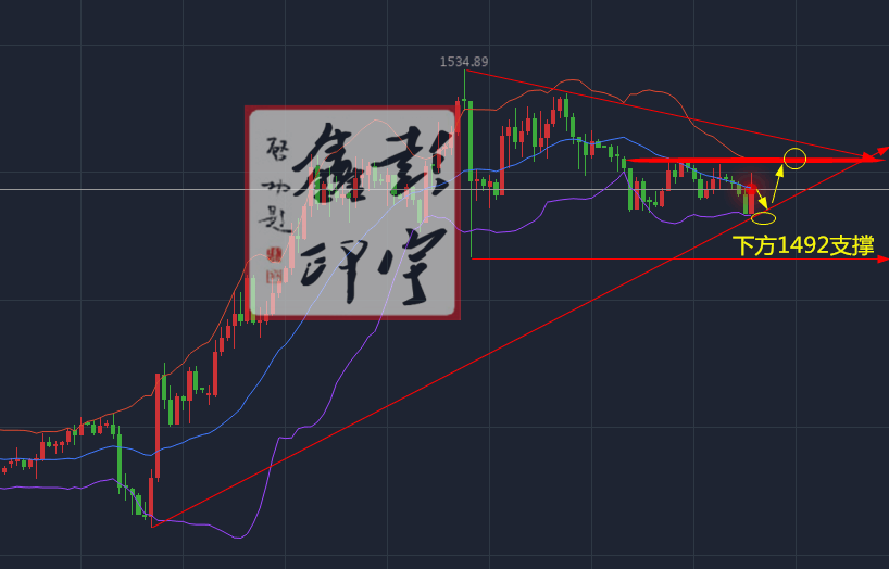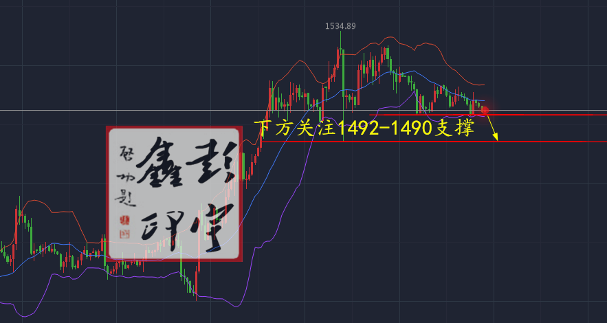 黄金今日属于慢节奏行情运行,虽然一直处于下跌状态,但是还是未能突破当前的震荡区间,只有突破1493的支撑后才能进一步打开下跌空间,下看1480,甚至1470区域,否则还是区间震荡! 黄金此前说过弧形顶是一种最常见的下跌调整形态,特别是在黄金如此强势的上涨之后!而且弧形顶的后期有一个加速的过程,这才是最精彩的地方,显然当前黄金还没有出现加速的过程!所以我们期待1493位置的破位,只有此位置破位后才能出现加速下跌的情形! 近日行情变化不大,美盘一如既往的看跌,唯一要关注的是震荡底部支撑1493的支撑作用!是否能破位成为当前行情走势的关键,以及未来调整的深度! 市场虐我千百遍,我待市场如初恋!反复