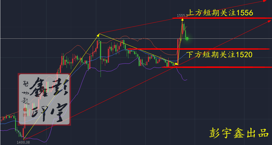 国际黄金行情走势分析: 黄金大趋势多头仍在继续,周五美盘前始终保持在1500下几美金的震荡,在此之前避险突然爆出大新闻,金价自低位反弹至1500上方,随后由于鲍威尔的讲话,让市场认为美联储似乎正对利率进行适度调整。但若全球前景继续恶化,美联储可能需要采取更具意义的降息措施,而这将会为美元带来负面影响,从而引发金融市场恐慌,黄金继续拥有避险属性,美盘继续大幅度暴涨,一度冲高至1530大关,涨势可谓不鸣则已,一鸣惊人! 短期看,目前黄金重回1520关口之上,毫无疑问,黄金还是上涨走势,周内1492多次不破,上涨也是有基础的,笔者彭宇鑫老师一直强调黄金只是缺少市场一个刺激,只要刺激到位,买盘就会跟