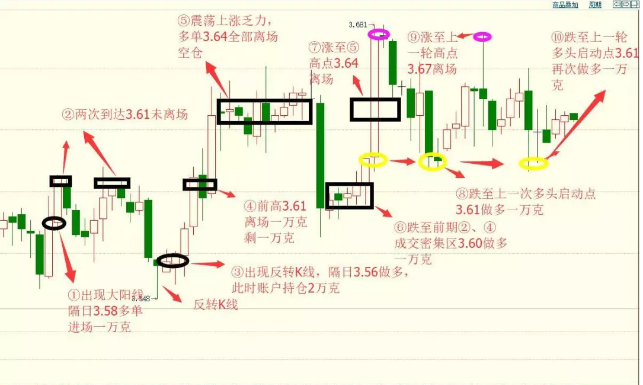 贵金属交易实战经验篇---仓位管理 首先,我们以账户银一段历史走势为例,通过对账户银价格的判断,整体波动在3.5-3.7这样的区间,所以我们都有十万了何不再拿点私房钱出来,2万就足够,先将资金加到12万。为什么是12万呢?是为了优化操作,每一份就是4万,正好是一万克的资金,所以每一次的开平仓我们都是做一万克,当然没有私房钱的同学可以按照同等比例去操作。 下面 HMA皇玛MT5( hmcfds ) 老师用自身实战操作图例告诉大家如何利用好这个“333”,以账户有12万资金作为参考 图中①是再一波下跌中出现一根阳线视为仿吞没,隔日方可多单进场一万克,成交价格3.58. 图中②两次到达3.61未达