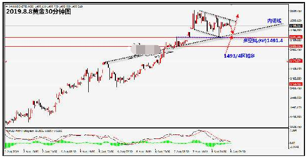 今日黄金交易策略,黄金守住1490依然低多 黄金上周经过大幅强势上涨,随后在1490-1510区域内震荡整理!周三盘面价格冲高1510停滞,周四周五价格持续围绕1510一线压制下方运行,持续探高不破高一定程度上削弱了拉升的动能,即使后续盘面上破也需要一个调整蓄势的过程,直接走高的动能明显不足,所以我们强调1510久攻不破看一波回落,美盘破位1500关口支撑下探1494一线,逼近我们强调的1490-93支撑区域!黄金大趋势看涨不变,短线震荡修正,所以今日我们回落之后再干多,依托1490-93区域支撑看涨! 周线大阳线,价格维持MA5,MA10均线上方运行,各周期均线呈多头排列,价格虽偏离各均线