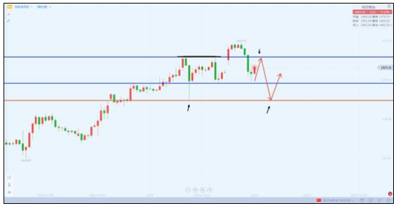 黄金转震荡修正,原油多头即将起航 今日黄金,在昨天激烈的冲击下,大多交易者的情绪在今天被调动起来,所以今天绝大多数人都会比昨天更加大胆,早间延续了昨晚的V型走势,一波拉升但是随后快速回落吞没,容易形成早盘急涨,难延续的行情,所以在今天大多人大胆激进的情绪之下,更应该放慢节奏保持冷静,操作上把时间节奏放在午后,毕竟修正行情总会出现,不能每天都去幻想涨不停。 黄金如图,早间冲高回落走V,上方水平压力位在1470附近,横截支撑1460一带,还有昨晚打出的低点1453也是快速反抽的位置,多头头寸的聚集地,早间的冲高回落看做多头能量的提前释放,所以今天可以在1470上方去依托顶部做空,做修正回调的单子