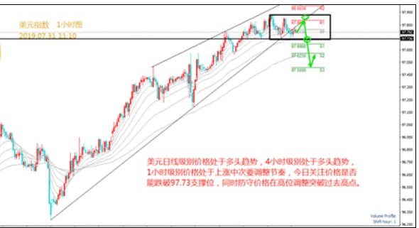 7月31日外汇黄金原油下单操作策略 策略说明: 1.黑色线/黑色区域表示:行情震荡调整意思。 2.红色线:表示行情上涨思路 3.绿色线:表示行情下跌思路 4.红色圈:表示计划做多位置 5.绿色圈:表示计划做空位置 6.灰色PP线:表示日内多空线位置 7.R1,R2,R3:表示:日内阻力位1,阻力位2,阻力位3 8.S1,S2,S3:表示:日内支撑位1,支撑位2,支撑位3 9.遵守市场客观行情前提下,进行对日内交易计划布局 美元日线级别价格处于多头趋势,4小时级别处于多头趋势,1小时级别价格处于上涨中次要调整节奏,皇玛外汇hmcfds分析师建议今日关注价格是否能跌破97.73支撑位,同时防守价