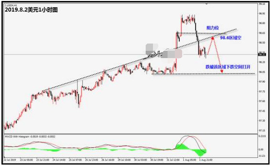美国非农数据来袭,美元98.6区域高空 美元 美联储鹰派的措辞提振美元指数创出近两年的新高,但是随着多头力量得到释放,以及美国制造业数据创2009年以来的新低,以及全球贸易风险的升温,使得美元指数冲高大幅回落,日内投资者需重点关注美国7月季调后非农就业人口数据。 技术面,日K线收一根带长上影线阴线,结束了连续连续9日连阳,价格再度年初高点的下方。因此,日内价格反抽美联储利率会议后上冲的高点参与空头。 美元策略:98.6区域做空,止损98.9,下看98.2,97.9 欧元 欧元尽管受到美联储鹰派政策的影响下跌至1.1025,创出近两年的新低,但是随着全面贸易情绪升温,美元指数暴跌,欧元大幅的攀