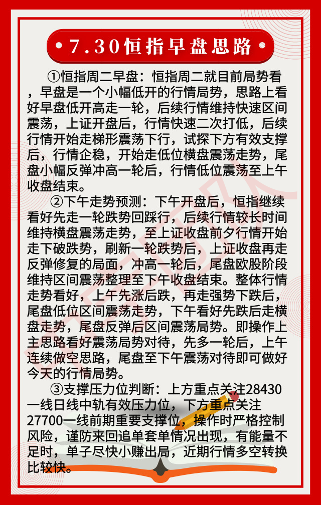 恒指周二早盘思路:恒指周二早盘就目前局势看,早盘是一个小幅低开的行情局势,思路上看好早盘低开高走一轮,后续行情维持快速区间震荡,上证开盘后,行情快速二次打低,后续行情开始走梯形震荡下行,试探下方有效支撑后,行情企稳,开始走低位横盘震荡走势,尾盘小幅反弹冲高一轮后,行情低位震荡至上午收盘结束。上方重点关注28430一线日线中轨有效压力位,下方重点关注27700一线前期重要支撑位,操作时严格控制风险。 文/恒指实盘喊单AIAINIMH希望我的文章能给你带来收获,在接下来的投资里顺风顺水,恒指实盘喊单一直给我的投资朋友强调,我们做投资不是投机,抓准时机,拒绝盲目,无时机请休息,请珍惜自己挣来的