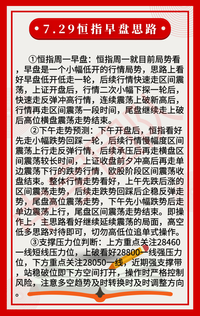 晚盘前瞻:恒指德指继续看好开盘先走小幅反弹走高一轮,后续快速区间震荡一小段时间,再走慢幅度反弹震荡上行,至美盘开盘后快速走跌势回踩,再次区间震荡后低位收盘结束。即操作上先多后空,主空趋势对待,严格控制风险,谨防区间套单。文章来源于恒指实盘喊单!!!
