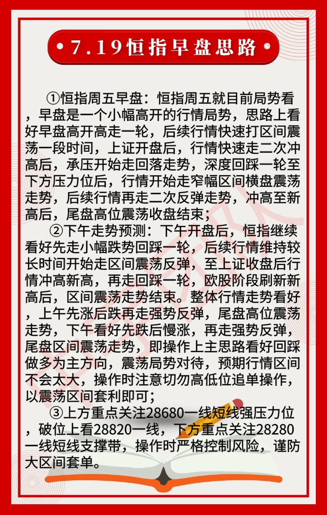 恒指周五早盘就目前局势看,早盘是一个小幅高开的行情局势,思路上看好早盘高开高走一轮,后续行情快速打区间震荡一段时间,上证开盘后,行情快速走二次冲高后,承压开始走回落走势,深度回踩一轮至下方压力位后,行情开始走窄幅区间横盘震荡走势,后续行情再走二次反弹走势,冲高至新高后,尾盘高位震荡收盘结束。上方重点关注28680一线短线强压力位,破位上看28820一线,下方重点关注28280一线短线支撑带,操作时严格控制风险,谨防大区间套单。文章来源于公众号恒指实盘喊单!!!