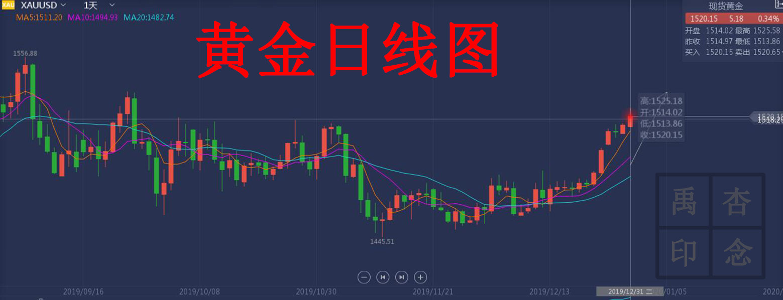 文:杏念禹 重点 : 2020年伦敦金行情 关于2020年黄金价格,现在已经跌至最低1517美元/盎司,不少买多的伙伴们可能直接爆仓了,而今日元旦休市,停盘至1517。昨日我发文建议止盈至1523,不少学员因此庆幸。避免了亏损。那么行情出现这样的波动,到底开市后还会不会继续涨下去呢?分析如下: 从小时线看晚间急跌。 根据 12月31日讯,周二亚盘,国际黄金延续了近段时间以来,早间直接起涨的规律,急涨至1520上方。 欧盘时段,黄金小幅震荡,截至发稿,黄金报价在1523.8美元/盎司。 美元急跌二次探底,黄金急涨攻破1520关口 ,。 而黄金在早间就掀起了高潮,亚盘初期黄金在1514附近急涨,
