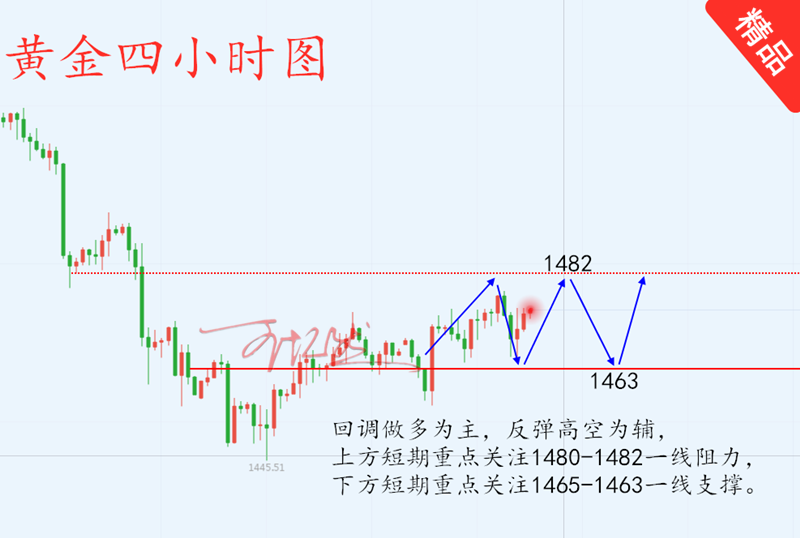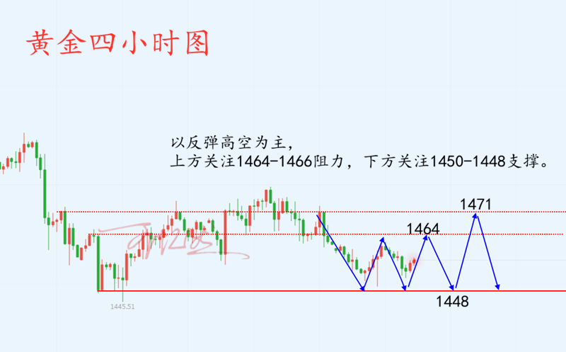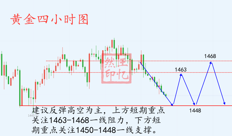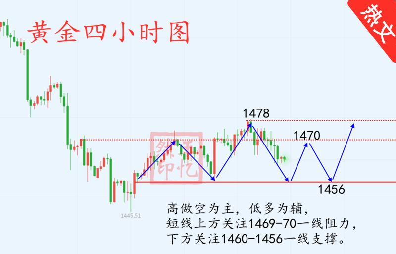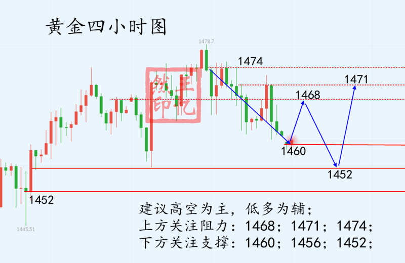 11.22黄金反弹空再获利,切勿被行情诱多! 黄金亏损不可怕,过去的就让它过去,未来就让它快点到来!好好休整自己,随时整装待发,忆然始终不离不弃陪伴在你身边!陪您一起盈利,重镇雄风! 【【黄金多空看不清?这样做才能盈利!】】 4小时级别上看,目前黄金运行的是低点走低,高点破新低的空头走势,K线上六连阴,几呼回吐了前半周的所有涨幅。目前布林带向下开口,K线在ma60下方运行,MACD死叉,绿柱持续发量,指标显示黄金目前处于空头走势中,因此操作上王忆然建议逢高做空为主,低多为辅,短线上方关注1469-70一线阻力,下方关注1460-1456一线支撑。 黄金操作策略; 反弹不破147