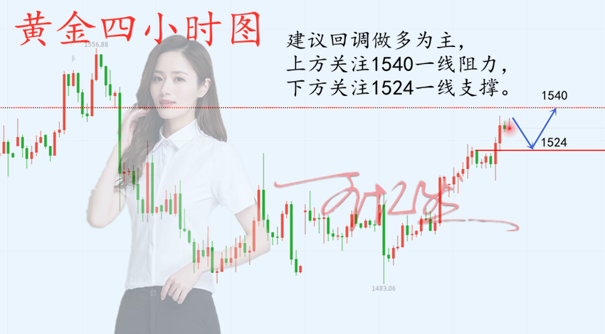 王忆然:9.25黄金涨势有余,操作分析及原油策略 投资生涯,每人都会有陷入迷茫的时候,既然你现在有幸了解了投资的魅力,那就不要轻易放弃,哪怕只是用最小的成本去尝试,有收获的往往是坚持到最后的人。最后还是那句话,盈利也许会迟到,但一定不会缺席! 【【【【黄金走势分析】】】】 4小时图上来看,4小时运行的是一个低点抬高高点创新高的多头走势,各均线指标多头排列完好,MACD金叉,灵动指标低位金叉向上发散,指标显示多头动能强劲,操作上优先考虑做多为主,高升综合来看,黄金目前处于多头走势中,注意1535双顶压力突破情况,日内操作上王忆然建议回调做多为主,上方关注1540一线阻力,下方关注1524一线支