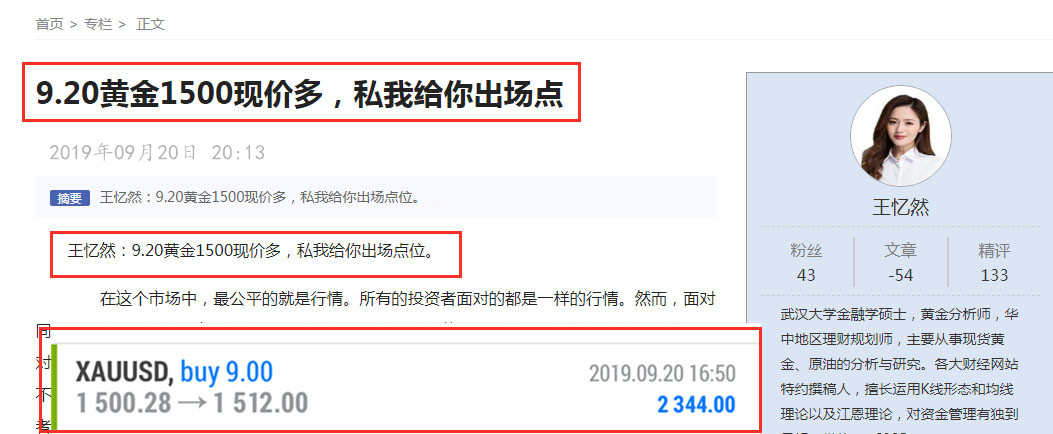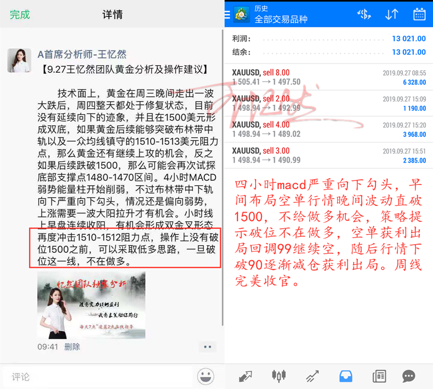 王忆然:9.28黄金本周实仓操作回顾,下周盈利等你 投资生涯,每人都会有陷入迷茫的时候,既然你现在有幸了解了投资的魅力,那就不要轻易放弃,哪怕只是用最小的成本去尝试,有收获的往往是坚持到最后的人。最后还是那句话,盈利也许会迟到,但一定不会缺席! 【【【【本周实仓操作回顾】】】】 人只有在经历过痛苦的时候才会醒悟,经历过磨难才会使人成长!而在投资市场,没经历过亏损,又怎会知道止损的重要性?尊重市场,市场永远是对的,错的只是人心的解读,顺势而为永远没错,这才是长久之计。 忆然还是想要特别强调几句,投资有风险,绝对不要贪,绝对不要太激进,这是投资不是投机,大家做单时一定一定要严格止盈止损,严格把握
