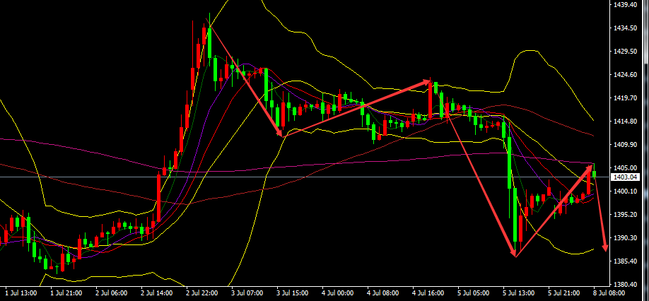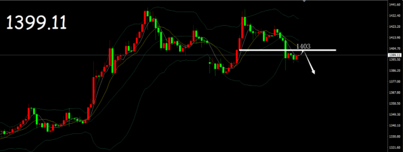若非生活所迫,谁愿意把自己弄的一身才华,自身掌握的技能,往往无法满足自己的欲望。努力到无能为力,拼搏到感动自己。俗话说:知我者谓我心忧,不知我者谓我何求?人生为什么要努力,因为你想要的东西太贵。我是胡鑫盛,在你任何时候需要帮助的时候都愿意帮你的那个人 作为投资人,一定要让自己变得专业,只有对 金融市场 专业了,才能清楚的认识市场。 黄金一小时线图: 黄金今天看小时线1405一线120日均线的压制,今天不能站稳1405一线就还是一个看空的走势,下方看1380-1383一线附近,上周最低1386一线低点还没有到位,黄金不站稳1405不做多,目前小时线布林带开始收口中,今天行情也不看太大,看140