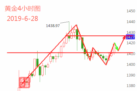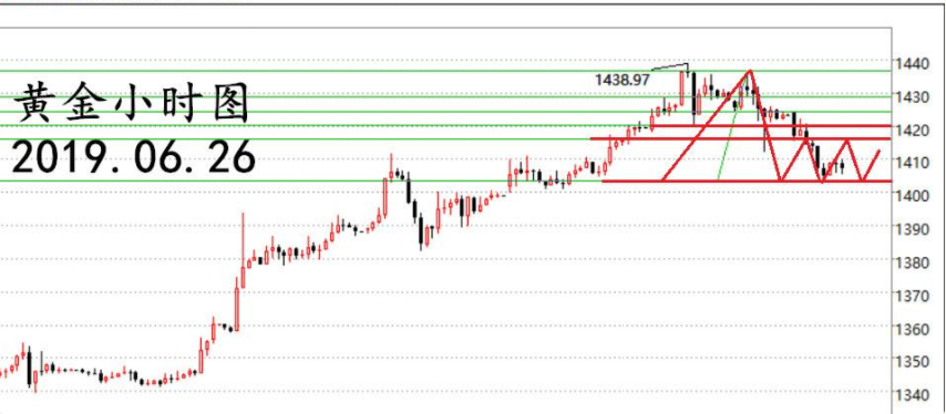 周三,国际黄金重回1410 美元 下方,跌幅扩大至近1%,刷新两日新低。因 美联储 主席鲍威尔讲话中未能就今年晚些时候的降息步伐给出任何新的线索,并打压了市场对美联储激进行动的预期, 美元指数 受到提振,最新报96.30附近,现货黄金大幅下跌,日内大跌逾10美元。黄金冲高回落,短线存在回调,日内关注美国耐用品订单数据,如果该数据依旧疲软,可能会再次打压美元反弹的势头,这或给黄金提供部分支撑,同时美伊紧张关系持续发酵也使得黄金获得支撑。 6月26国际 黄金走势 分析: 伦敦金 方面,凌晨鲍威尔讲话杀伤力太强,金价刷新低点,今日延续性走弱,1403一线止跌反弹,目前报价1408.5,依托布林下轨