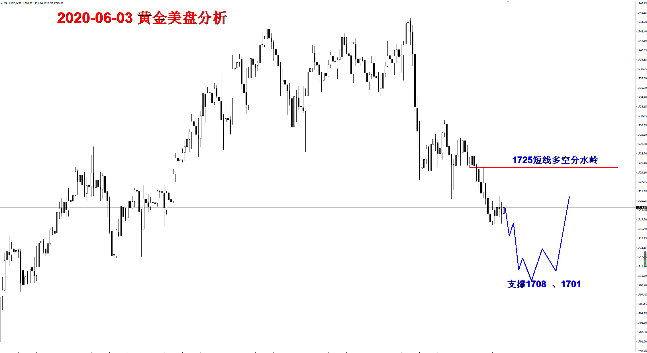 凌佳言:6.4黄金高位横盘,回撤马上做多,非农50点利润提前布局 周四(6月4日)亚市盘中,现货黄金在上日暴跌近30美元后,试图在1700美元上方保持坚挺,日内最高触及1705美元附近。黄金价格周三收于逾三周最低水平,未能找到支撑,因股市需求回升,且数据显示美国民间部门就业减少幅度小于预期,削弱了与避险相关的黄金需求。 而黄金“周三则像纸牌搭成的房子一样坍塌,由于投资者忽视了美国的内乱,而把重点放在央行干预和经济复苏的希望上。”但由于市场情绪改善,金价短期内料将进一步走软,首个支撑为1,680美元。如果跌破这一点位,金价可能会跌回4月中旬以来未见的水准1,665美元左右。 黄金走势分析 黄金