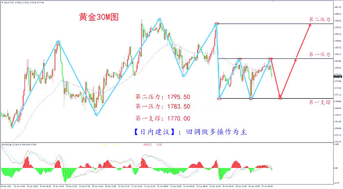 今日周四,明天非农数据,今天也是五一小长假之后国内开盘的第一个交易日;行情没有意外的走了一把多头,在五一休市之前我们提示了“假日阴谋”论,节前的最后一个交易日黄金1800关口遇阻暴跌最低1760下方;这给了市场一个假信号:行情见顶,开始下跌。我们在节前重点强调,国际主力一定会利用这个假期收割一波,目前来看节前博空的投资者已经被套;既然主力将他们套住,那么短期就不会给他们出逃的机会。因此的话,黄金下跌1760和上坡1800的概率来看,是上破1800关口的概率比较大! 从来不跟风,是我一惯的作风!1680抄底看涨以来我们一路布局多单,每天我们强调最多的都是如何操作;我们从来不把行情放在第一位,因