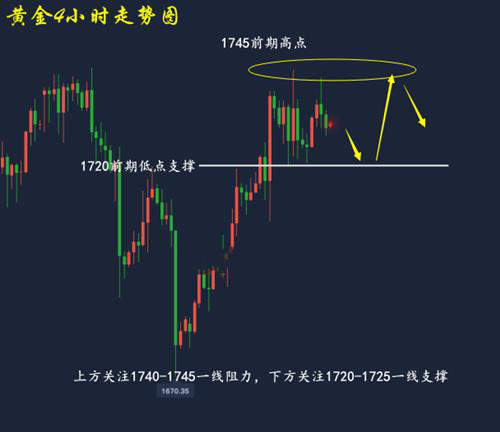 提示:今日公布美国5月零售销售月率和鲍威尔就美联储的半年度货币政策报告作证词! 黄金昨日下探1704后快速拉起,今日延续多头涨势,并且在欧盘回落时站稳1720,多头反弹依然强势,美盘依托1720依然干多看涨! 黄金当前在日线区间内波动,走区间内的反弹段,而昨日的回踩也没有再次新低,和此前的下跌波段不同,今日行情又快速拉起,暂时受到昨日高点1734的压制,美盘的任务就是突破1734,那么行情必然上涨测试1745的压力,而且突破的概率极大!消息上需要关注5月零售月率,一般来说,数据利空的可能性更大,如果利空而黄金不跌,那么将会更加坚定我们做多的决心! 黄金短线最重要的支撑是1720位置,今日