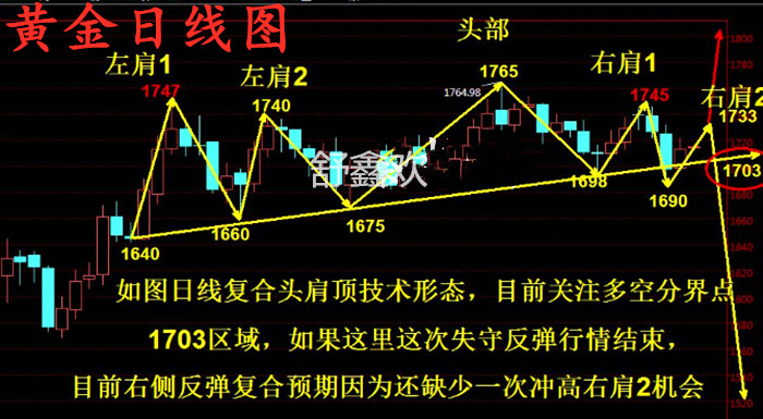 舒鑫欢:黄金开盘下跌能反弹?多单还有救?黄金原油今日解读 老手怕震荡,新手怕单边,因为往往一出现单边行情,很多新手投资者都会出现一个问题,是底吗?是顶吗?其实猜的再多,那还不如执行来的实在?往往思考过多,给我们带来的就是踏空,错过。投资道路并不是想象的那样简单,行情波动的背后有着太多的影响因素。不懂投资,却想通过投资赚钱的朋友,你们的不擅长只会达到相反的结果,专业的事情交给专业的人,你的财富才有可能增值! 黄金上周回顾 黄金上周大阴,改变了目前多头的结构,所以毫无疑问,本周黄金整体是看回落的。但是上周尾的大跌,本周初预计会先调整,调整完毕后再下跌。非农的下跌口在1705位置,这里是黄金目前的