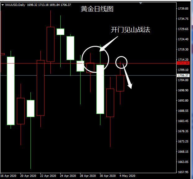 舒鑫欢:炒黄金k线你应该知道的黄金战法 昨天黄金冲高1713附近回落,在小周期上留下一个比较长的上引线。如下图一。为什么呢?主要是因为大周期压力形成,我们“开门见山战法”就很好的能解释这一切了。如下图二黄金日线图。 难道这个是偶然吗?显然不是,我们举例说明,如大家经常看到的上证指数图三所示。 偶然吗?肯定不是偶然的,万事万物皆有规律,我们可以运用数学的论证法来证明。比如一波行情一定有且只有一个最高的点位。 1,很好理解嘛,不可有两个高点的,总会有一个高点比另一高点数字大的,就算相等,那么高点也就都只有这一个。 2,既然只有一个高点,那么一定有人知道这个位置可以获利且不会亏损,那么你会不会思考