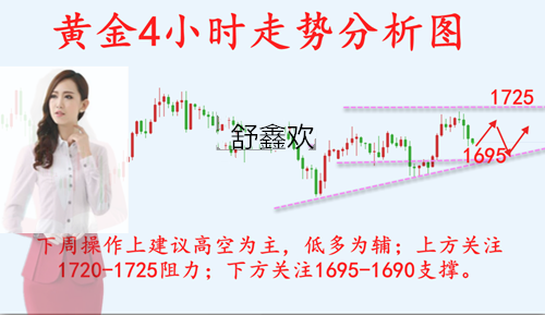 舒鑫欢:5.9本周实盘获利百点,附下周操作策略 昨日黄金市场亚欧盘震荡走高,最高碰触上轨阻力1723附近,但未突破。而晚间随着非农数据好于预期,对金价构成利空,行情短期打破三角形概率较小,依旧是震荡进行布局,黄金布局4单获利20个点。以这样的成绩收官也还是不错的。当下实实在在赚钱,投资不易,且行且珍惜,风险控制远远要比收益重要,留得青山在,不怕没柴烧,失控的风险会吞噬一切,这就是为什么做单原则很重要。 黄金4小时布林带开口,MACD金叉,红色能量柱缩减;KDJ金叉,随机指标温和向下;这表明金价短线多头不足接下来将有望展开震荡回调之势。下方先关注1700短线支撑,同时还受到1
