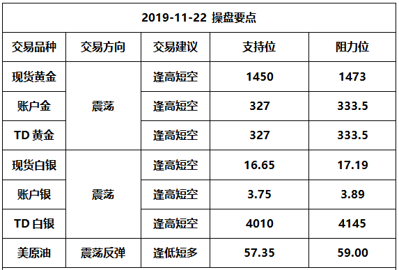 一、基本面分析 昨日黄金企稳于1452美元展开反弹收盘在1462美元/盎司,白银企稳于16.82美元展开反弹收盘在16.91美元;昨天中国黄金和山东黄金分别收盘在5.85和29.88元/股;美国原油昨日震荡收盘在55.95美元/桶。影响因素分析看,首先,此前公布的数据显示,美国11月制造业活动连续第四个月萎缩,且建筑支出意外下滑,令市场担心美国可能陷入衰退。其次,受到积极的亚洲经济数据打压,来自太平洋两岸的积极经济消息都有可能导致金价发生重大调整,所以影响金价的关键因素在于经济面的消息。第三,全球最大的黄金ETF-SPDR当前净持仓:895.60吨不变。全球最大的白银ETF-iShares当