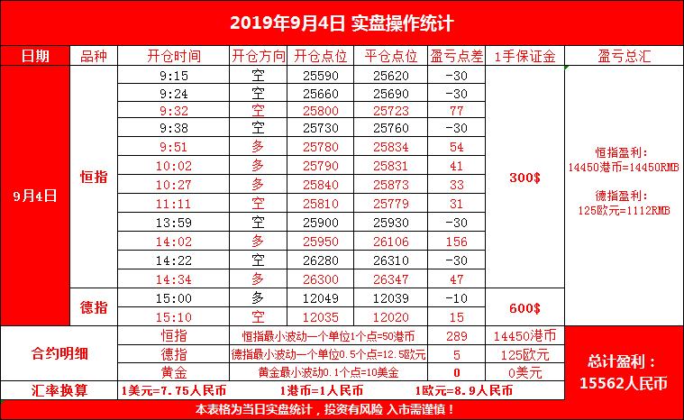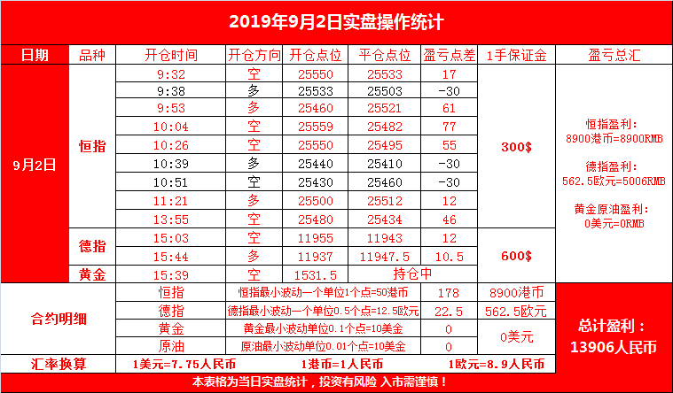 今日小结: 行情回顾:恒指早盘低开低走一轮,连续震荡后受上证开盘快速下跌连续下破低位小幅反弹再次走跌,减缓波动后震荡下跌至今日低位25264后行情快速反转,连续高走回补跌势缺口,震荡横盘至收盘,下午开盘高走一轮小幅回跌后上证收盘后快速高走补缺早盘低开缺口后,回踩一轮再次高走至收盘,整体是一个宽幅的不规则震荡走势。 盘中建议: 恒指:早盘预计今日行情与实盘有所偏差,早盘第一单,因没有及时出局而导致止损,后见空头局势强势连续给出空头思路建议挽回损失,后续因行情的转向较为突然,多头行情没有及时把握住,下午见行情有所稳定后连续开仓获利整体指导表现不错 黄金:开仓点位较低,预判的压力区间低于实际行情的