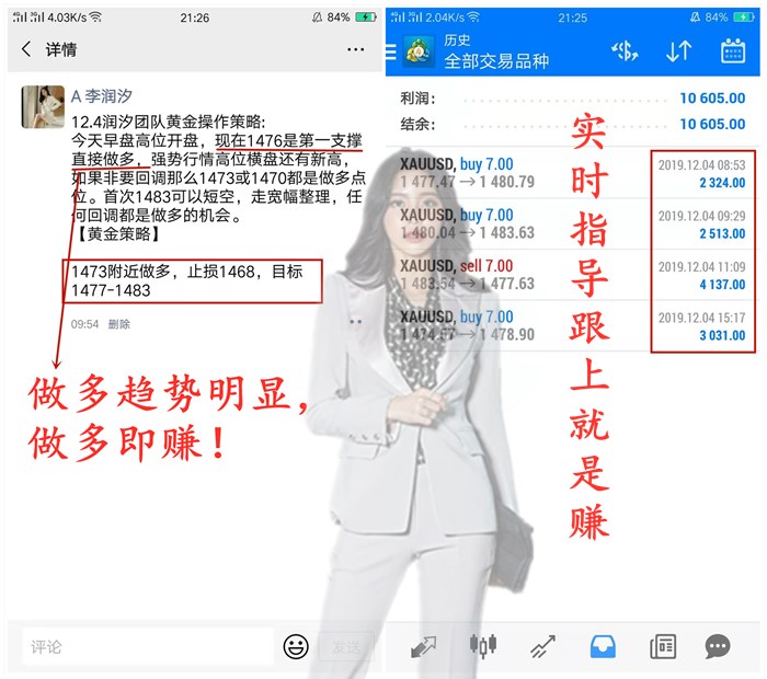 李润汐:12.5黄金喊单豪取60万,低多看1490,96%胜率助你非农回本! 在这个市场赚钱永比亏钱难!你需要花费百分百的力气!但,依旧有人赚钱!润汐能够建立一套属于自己的赚钱系统,让市场说话,比任何的理论都靠谱。 ==黄金行情分析== 黄金高位横盘,支撑压力位高空低多,压力位1483,支撑位1472-1468,早盘1468以上做多,1472是趋势线支撑,可以做多,横盘就会涨,冲高1483再做空,如果1476都上去回调1468还是做多。坚决按计划做多。 【黄金策略】 1472附近做多,止损1466,目标1477-1483 1468附近做多,止损1463,目标1472-1478