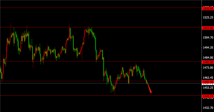 交易之路慢慢,随波逐流者多之!不谋全局者不足谋一城,市场风云,变幻莫测,定其心,观其势,谋定而后动,不乱于心,不困于情,运筹帷幄之中,方能决胜千里之外。名声与尊贵,来自于真才实学,有德自然香,大家好,我是李茉馨! 下周黄金走势分析 消息面:周五(11月22日)现货黄金回吐日内涨幅转跌,一度较日高回落近12美元,刷新近四日低点至1461.40美元/盎司;此前公布的数据显示美国制造业和服务业活动加速,提振了美元,限制了对黄金的避险需求。 技术面:黄金日线上是先涨后跌的走势最终承压1480压力位置再次下跌,下周大概路会再次测试前低1445位置,也是日线布林下轨位置的支撑,下周的操作思路就是反弹