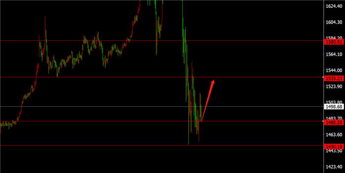 交易之路慢慢,随波逐流者多之!不谋全局者不足谋一城,市场风云,变幻莫测,定其心,观其势,谋定而后动,不乱于心,不困于情,运筹帷幄之中,方能决胜千里之外。名声与尊贵,来自于真才实学,有德自然香,大家好,我是李茉馨! 3.21黄金走势详解 消息面:本周黄金震荡走跌,因流动性需求市场继续抛售黄金,推动美元站上100关口,最高触及103一线附近,但是因六家主流央行宣布协同行动以增强美元流动性,周五黄金收复部分失地。 技术面:虽然昨日黄金早盘跌至1450区域,随后快速拉升,美盘再次下挫,但是在1480区域获得支撑后反弹。当前黄金阶段性底部形态,下周黄金预计是探底反弹的走势,第一步测试1535压力位置,