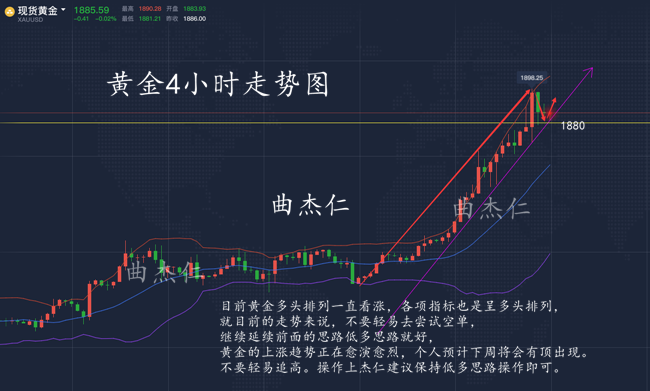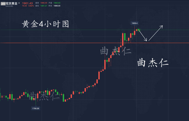 曲杰仁:黄金短线回撤不是下跌趋势,周线收官将助力价格更上一层楼! 单边行情参与需要勇气,震荡行情参与需要耐心。没有勇气做不了大事,没有耐心做不成大事,太多的人每天怀揣希望而来,收获绝望而归,不是市场与你调侃,也不是你的勇气太差。是你没有专业稳健的指导而已。 "老师现在可以做空吗?",无数次听到这句话,我的回答无数次是不可以,做投资不是随时都可以进场的,一个进可攻,退可守的点位,是投资的重中之重,不好的点位只会是进退两难,如果你在一个很不好的点位问我,我必然不会让你去做,没有意义的点位,进场了也是坐以待毙,我常说宁愿不做,也不可做错; 周四续刷9年高位,欧盘进一步逼近1900美元关口。同时市场