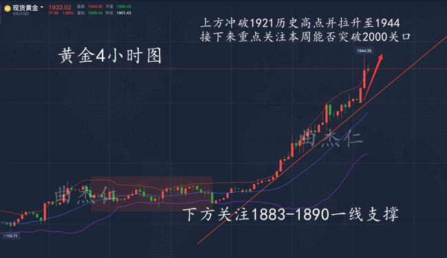 曲杰仁:黄金一路飙升冲破9年历史新高!多单直接进看1930! 最近经常有人找到曲杰仁问单子被套了怎么办?终其原因无非就是方向做反了,没有及时止损,与行情对堵。盲从的扛单直至最后无法挽回造成自己重大的亏损。很多人都会选择性的忘记做投资的初衷。亏小赚大,稳健获利才是我们进入这个市场最开始的标准。不管你是经验丰富亦或者是刚进入市场的新手,请记住严格止损才是你能赚到钱的最大保障。每一位在读这篇文章的人,感谢与你相遇!简单的一篇文章,希望会帮助你。 上周(7月20-24日)黄金多头实现大爆发,因中.美.紧张局势进一步升级,由此引发的避险情绪成为金价大涨的最大动力。此外,美元走软、收益率下降、更多的财政