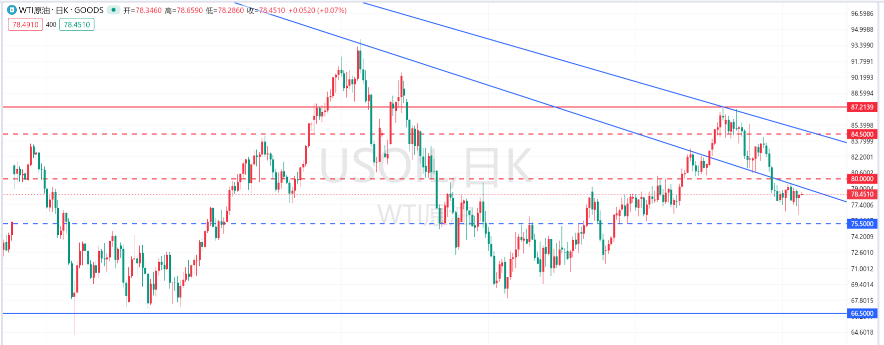 原油现价78.598美元,这几日的行情在80之下76之上不断试探,昨日更是来了个回手掏,慢慢磨下来的行情,EIA一个数据便直接把油价又拉了回去,整个市场的多空情绪还未稳定。昨日收阳线基本上是消息面的利多影响,接下来就看今日初请失业金能够给到怎样的数据。 基本面日线周线都已经提前走空,日线级别还在震荡,今晚数据如果能够给个利空,那么接下来的行情就会很好做,整体上我们坚持看空原油,主要的操作也是做空为主。前几日向希在文中一直强调靠近80美元附近就大胆去做多,这几日只给到两次机会,虽然进场机会不多,但是好在利润都不错,入场基本上都有200个点的利润。 昨日收线情况不利于我们现价跟空,技术面还有接近
